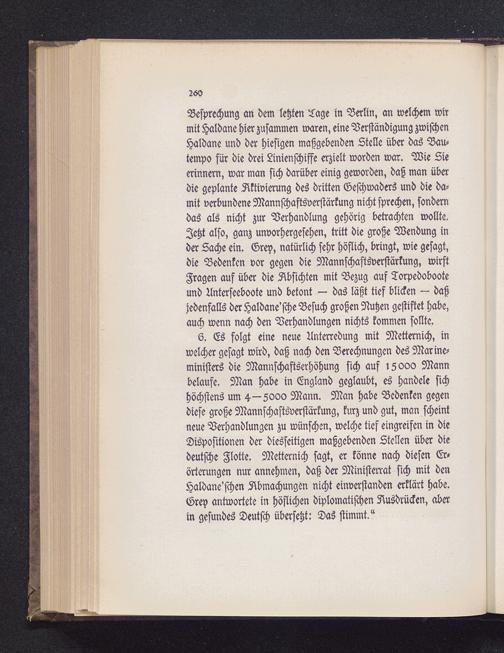 6. Es folgt eine neue Unterredung mit Metternich, inwelcher gesagt wird, daß nach den Berechnungen des Marine-ministers die Mannschastserhöhung sich auf 15000 Mannbelaufe. Man habe in England geglaubt, es handele sichhöchstens um 4—5000 Mann. Man habe Bedenken gegendiese große Mannschaftsverstärkung, kurz und gut, man scheintneue Verhandlungen zu wünschen, welche tief eingreifen in dieDispositionen der diesseitigen maßgebenden Stellen über diedeutsche Flotte. Metternich sagt, er könne nach diesen Er-örterungen nur annehmen, daß der Ministerrat sich mit denHaldane'schen Abmachungen nicht einverstanden erklärt habe.Grey antwortete in höflichen diplomatischen Ausdrücken, aberin gesundes Deutsch übersetzt: Das stimmt."