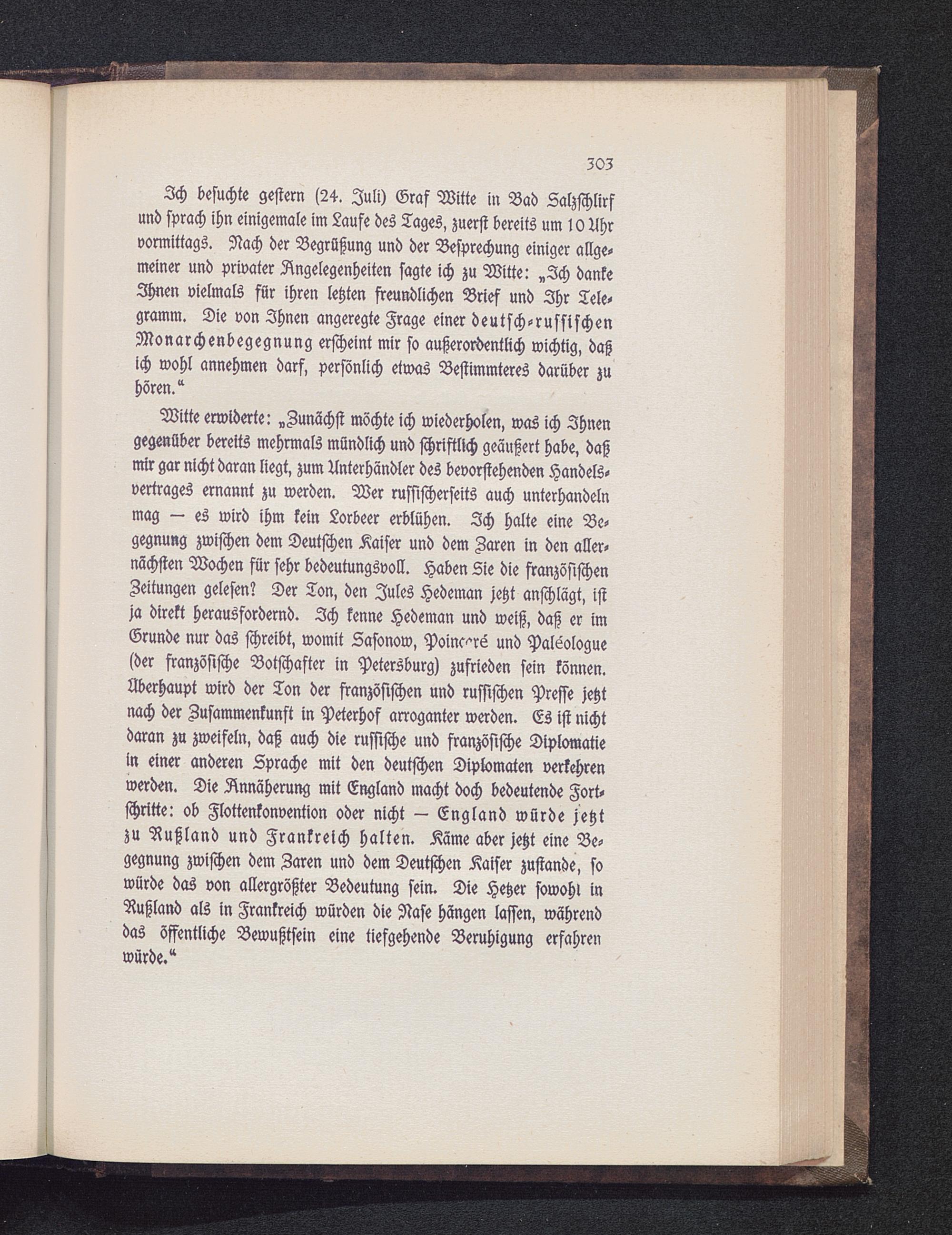 2ch besuchte gestern (24. Juli) Graf Witte in Bad Lalzschlirfund sprach ihn einigemal im Laufe des Tages, zuerst bereits um l 0 Ahrvormittags. Nach der Begrüßung und der Besprechung einiger allge-meiner und privater Angelegenheiten sagte ich zu Witte: „Zch dankeIhnen vielmals für ihren letzten freundlichen Brief und Ihr Tele-gramm. Die von Ihnen angeregte Frage einer deutsch -russischenMonarchenbegegnung erscheint mir so außerordentlich wichtig, daßich wohl annehmen darf, persönlich etwas Bestimmteres darüber zuhören/