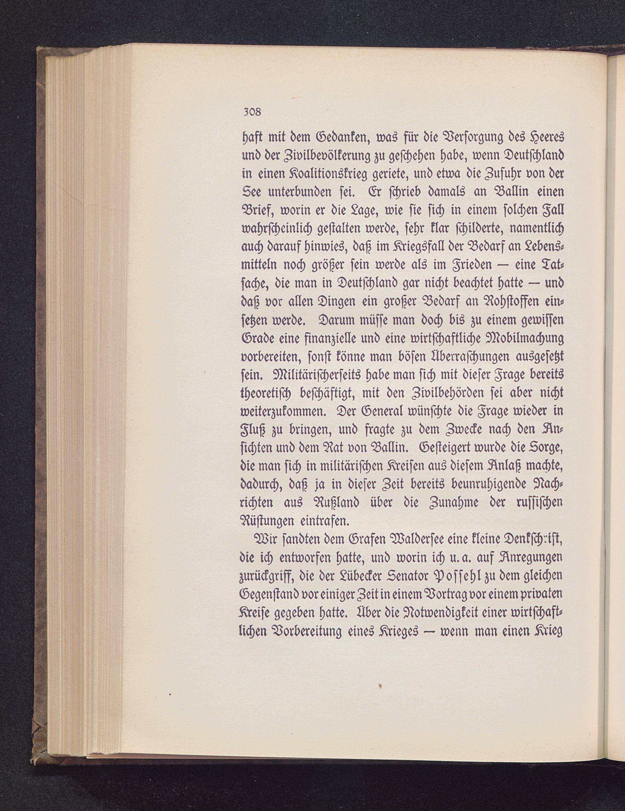 Wir sandten dem Grafen Waldersee eine kleine Denkschrift,die ich entworfen hatte, und worin ich u. a. auf Anregungenzurückgriff, die der Lübecker Lenator Possehl zu dem gleichenGegenstand vor einiger Zeit in einem Vortrag vor einem privatenKreise gegeben hatte. Über die Notwendigkeit einer wirtschaft-lichen Vorbereitung eines Krieges — wenn man einen Krieg