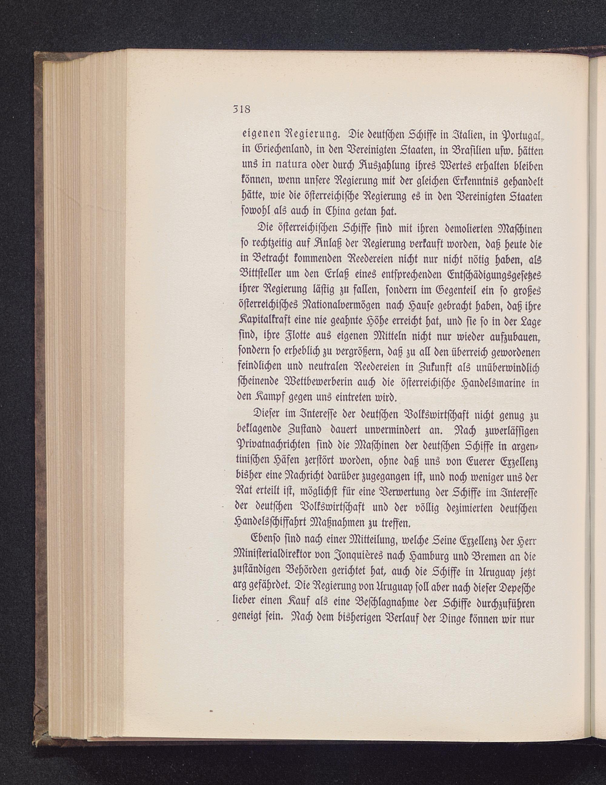 Dieser im Interesse der deutschen Volkswirtschaft nicht genug zubeklagende Zustand dauert unvermindert an. Nach zuverlässigenPrivatnachrichten sind die Maschinen der deutschen Schiffe in argen-tinischen Häfen zerstört worden, ohne daß uns von Euerer Exzellenzbisher eine Nachricht darüber zugegangen ist, und noch weniger uns derRat erteilt ist, möglichst für eine Verwertung der Schiffe im Interesseder deutschen Volkswirtschaft und der völlig dezimierten deutschenHandelsschiffahrt Maßnahmen zu treffen.
