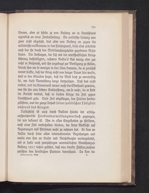 Tatsächlich ist auch durch Ballins Hände der erfolg-versprechendste Friedensvermittlungsversuch gegangen,der mir bekannt ist. Ihn in allen Einzelheiten zu schildern,muß einer Zeit vorbehalten bleiben, die keine Rücksicht aufRegierungen und Personen mehr zu nehmen hat. Er kam anBallin durch seine alten internationalen Beziehungen undwurde von ihm an Kaiser und Reichskanzler weitergeleitet,und er hatte nach zweijährigen unermüdlichen BemühungenAnfang 1917 dahin geführt, daß eine direkte Fühlungnahmezwischen den feindlichen Parteien bevorstand. Da kam die