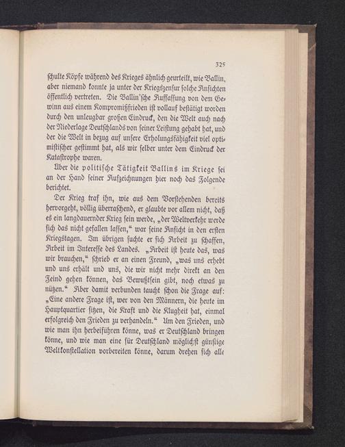 Der Krieg traf ihn, wie aus dem Vorstehenden bereitshervorgeht, völlig überraschend, er glaubte vor allem nicht, daßes ein langdauernder Krieg sein werde, „der Weltverkehr werdesich das nicht gefallen lassen/ war seine Ansicht in den erstenKriegstagen. Am übrigen suchte er sich Arbeit zu schaffen,Arbeit im Interesse des Landes. »Arbeit ist heute das, waswir brauchen/ schrieb er an einen Freund, »was uns erhebtund uns erhält und uns, die wir nicht mehr direkt an denFeind gehen können, das Bewußtsein gibt, noch etwas zunützen/ Aber damit verbunden taucht schon die Frage auf:»Eine andere Frage ist, wer von den Männern, die heute imHauptquartier sitzen, die Kraft und die Klugheit hat, einmalerfolgreich den Frieden zu verhandeln/ Am den Frieden, undwie man ihn herbeiführen könne, was er Deutschland bringenkönne, und wie man eine für Deutschland möglichst günstigeWeltkonstellation vorbereiten könne, darum drehen sich alle