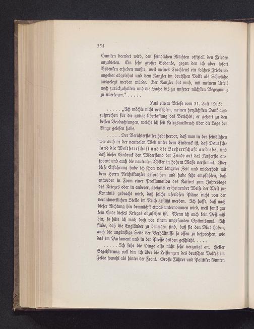 wie auch in der neutralen Welt unter dem Eindruck ist, daß Deutsch-land die Weltherrschaft und die Leeherrschaft anstrebe, unddaß dieser Eindruck den Widerstand der Feinde auf das Äußerste an-spornt und auch die neutralen Völker in hohem Maße verstimmt. Aberdiese Erfahrung habe ich schon vor längerer Zeit und wiederholt mitdem Herrn Reichskanzler gesprochen und habe sehr empfohlen, daßentweder in Form einer Proklamation des Kaisers zum Jahrestagedes Krieges oder in anderer, geeignet erscheinender Weise der Welt zurKenntnis gebracht wird, daß solche uferlosen Pläne nicht von derverantwortlichen Stelle im Reich gestützt werden. Ich hoffe, daß nachdieser Richtung hin demnächst etwas unternommen wird, weil sonst garkein Ende dieses Krieges abzusehen ist. Wenn ich auch kein Pessimistbin, so hüte ich mich doch vor einem ungesunden Optimismus. Ichfinde, daß die Engländer zu beneiden sind, daß sie den Mut haben,auch die ungünstige Leite der Verhältnisse so offen zu besprechen, wiedas im Parlament und in der Presse drüben geschieht.