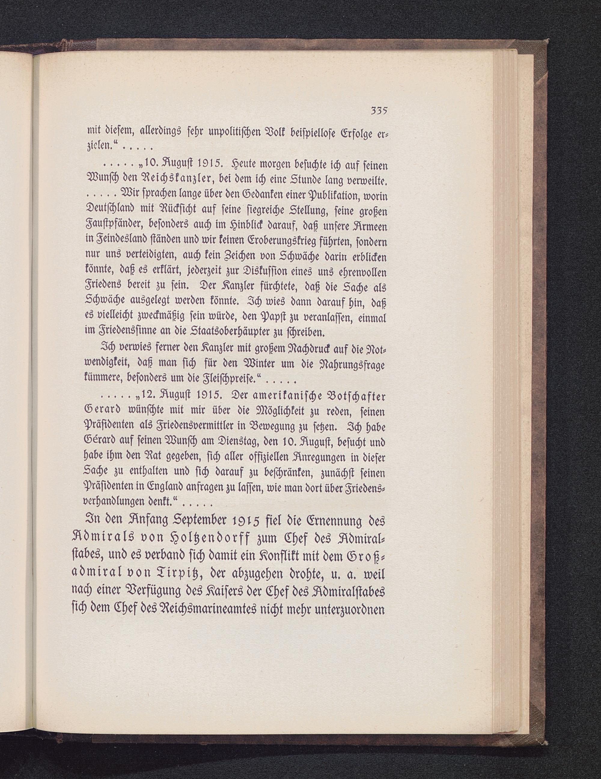 Deutschland mit Rücksicht auf seine siegreiche Stellung, seine großenFaustpfänder, besonders auch im Hinblick darauf, daß unsere Armeenin Feindesland ständen und wir keinen Eroberungskrieg führten, sondernnur uns verteidigten, auch kein Zeichen von Schwäche darin erblickenkönnte, daß es erklärt, jederzeit zur Diskussion eines uns ehrenvollenFriedens bereit zu sein. Der Kanzler fürchtete, daß die Zache alsSchwäche ausgelegt werden könnte. 2ch wies dann darauf hin, daßes vielleicht zweckmäßig sein würde, den Papst zu veranlassen, einmalim Friedenssinne an die Staatsoberhäupter zu schreiben.