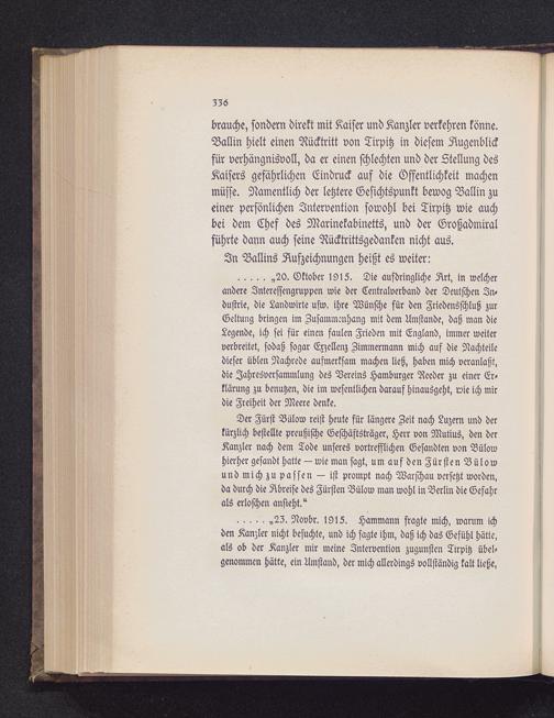 brauche, sondern direkt mit Kaiser und Kanzler verkehren könne.Ballin hielt einen Rücktritt von Tirpitz in diesem Augenblickfür verhängnisvoll, da er einen schlechten und der Stellung desKaisers gefährlichen Eindruck auf die Öffentlichkeit machenmüsse. Namentlich der letztere Gesichtspunkt bewog Ballin zueiner persönlichen Intervention sowohl bei Tirpitz wie auchbei dem Chef des Marinekabinetts, und der Großadmiralführte dann auch seine Rücktrittsgedanken nicht aus.