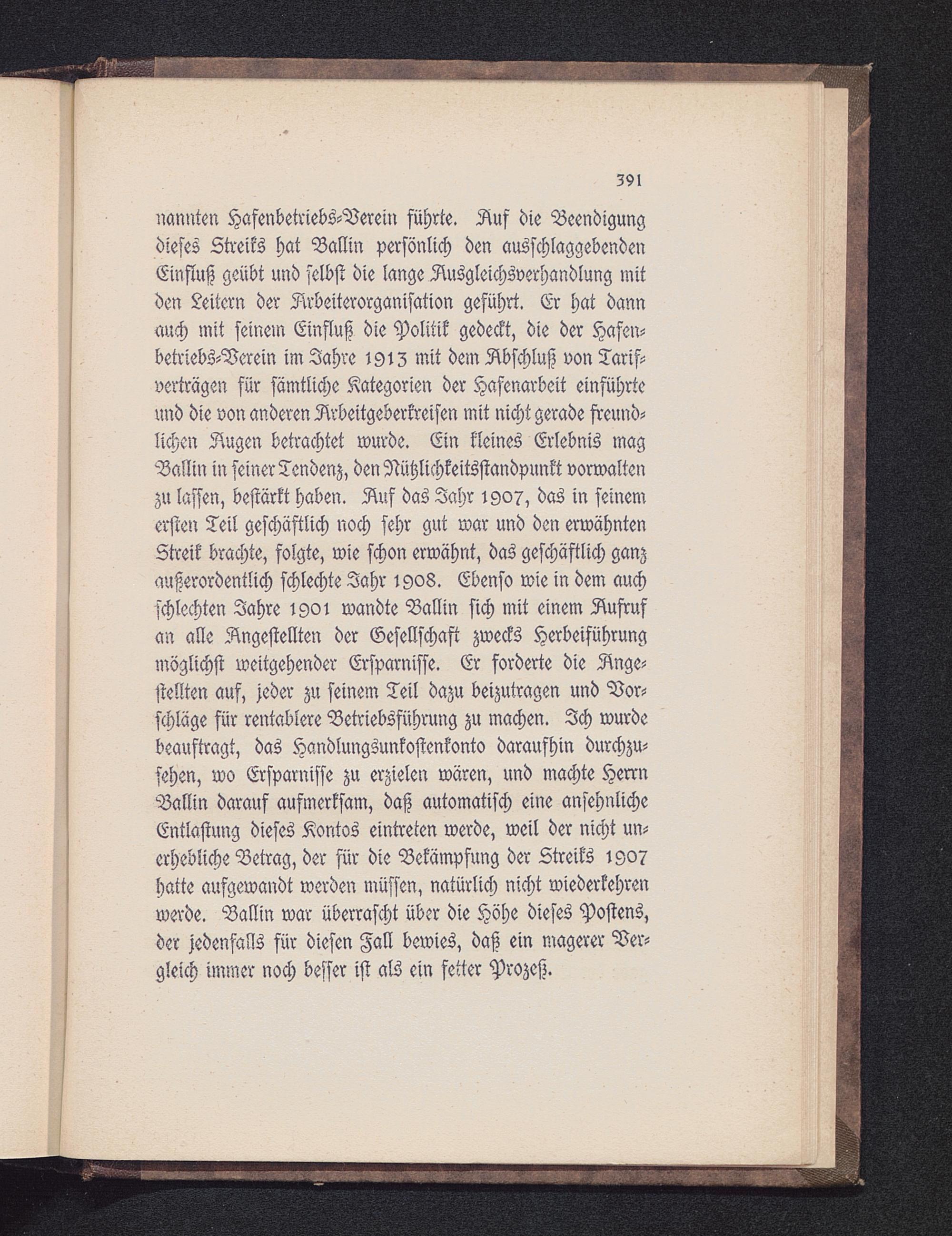 nannten Hafenbetriebs-Verein führte. Äuf die Beendigungdieses Streiks hat Ballin persönlich den ausschlaggebendenEinfluß geübt und selbst die lange Ausgleichsverhandlung mitden Leitern der Arbeiterorganisation geführt. Er hat dannauch mit feinern Einfluß die Politik gedeckt, die der Hafen-betriebs-Verein im Äahre 191z mit dem Abschluß von Tarif-verträgen für sämtliche Kategorien der Hafenarbeit einführteund die von anderen Arbeitgeber-kreisen mit nicht gerade freund-lichen Augen betrachtet wurde. Ein kleines Erlebnis magBallin in seiner Tendenz, denNühlichkeitsstandpunkt vorwaltenZu lassen, bestärkt haben. Auf das Jahr 1907, das in seinemersten Teil geschäftlich noch sehr gut war und den erwähntenStreik brachte, folgte, wie schon erwähnt, das geschäftlich ganzaußerordentlich schlechte Jahr 1908. Ebenso wie in dem auchschlechten Jahre 1901 wandte Ballin sich mit einem Aufrufan alle Angestellten der Gesellschaft zwecks Herbeiführungmöglichst weitgehender Ersparnisse. Er forderte die Ange-stellten auf, jeder zu seinem Teil dazu beizutragen und Vor-schläge für rentablere Betriebsführung Zu machen. Ich wurdebeauftragt, das Handlungsunkostenkonto daraufhin durchzu-sehen, wo Ersparnisse zu erzielen wären, und machte HerrnBallin darauf aufmerksam, daß automatisch eine ansehnlicheEntlastung dieses Kontos eintreten werde, weil der nicht un-erhebliche Betrag, der für die Bekämpfung der Streiks 1907hatte aufgewandt werden müssen, natürlich nicht wiederkehrenwerde. Ballin war überrascht über die Höhe dieses Postens,der jedenfalls für diesen Fall bewies, daß ein magerer Ver-gleich immer noch besser ist als ein fetter Prozeß.