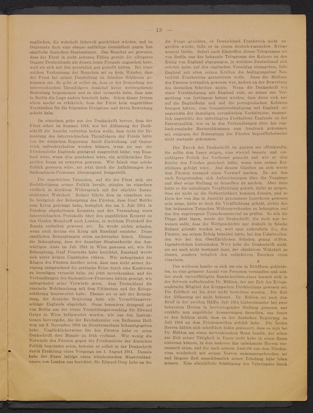 Des weiteren handle es sich um ein in Briefform gekleide-tes, an eine grössere Anzahl von Personen versandtes und seit-her stark vervielfältigtes Rundschreiben »eines zurzeit sich inder Schweiz aufhaltenden Dr. Miihlon, der zur Zeit des Kriegs-ausbruchs Mitglied des Kruppschen Direktoriums gewesen sei.Die Echtheit sei bis jetzt nicht bestritten worden. Die Zeitder Abfassung sei nicht bekannt. Dr. Miihlon sei nach demBrief in der zweiten Hälfte Juli 1914 hintereinander bei- zweibekannten Herren in hervorragender Stellung gewesen underzählte nun angebliche Aeusserungen derselben, aus denener den Schluss zieht, dass es der deutschen Regierung imJuli 1914 an dem Friedenswillen gefehlt habe. Die' beidenHerren hätten sich schriftlich dahin goäussert, dass es sich beiDr. Mühlon um einen nervenkranken Mann handle, der schonzur Zeit seiner Tätigkeit in Essen nicht habe in einen Raumeintreten können, in dem mehrere ihm unbekannte Herren ver-sammelt seien, und der nach seinem Austritt aus dem Direkto-rium wiederholt mit seinen Nerven zusammengebrochen seiund längere Zeit ausschliesslich seiner Erholung habe lebenmüssen. Eine absichtliche Schädigung des Vaterlandes durch