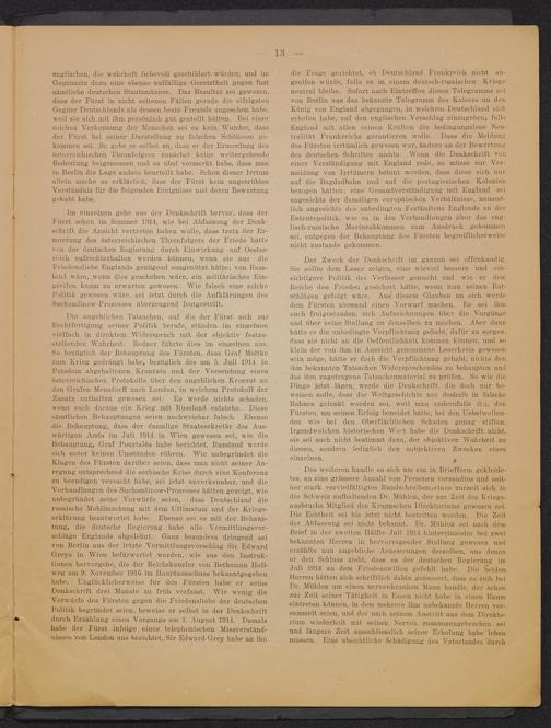 englischen, die wahrhaft- liebevoll geschildert würden, und imGegensatz dazu eine ebenso auffällige Gereiztheit gegen fastsämtliche deutschen Staatsmänner. Das Resultat sei gewesen,dass der Fürst in nicht seltenen Fällen gerade die eifrigstenGegner Deutschlands als dessen beste Freunde angesehen habe,weil sie sich mit ihm persönlich gut gestellt hätten. Bei einersolchen Verkennung der Menschen sei es kein Wunder, dassder Fürst bei seiner Darstellung zu falschen Schlüssen ge-kommen sei. So gebe eT selbst zu, dass er der Ermordung desösterreichischen Thronfolgers zunächst keine weitergehendeBedeutung beigemessen und es übel vermerkt habe, dass manin Berlin die Lage anders beurteilt habe. Schon dieser Irrtumallein mache es erklärlich, dass der Fürst kein ungetrübtesVerständnis für die folgenden Ereignisse und deren Bewertunggehabt habe.