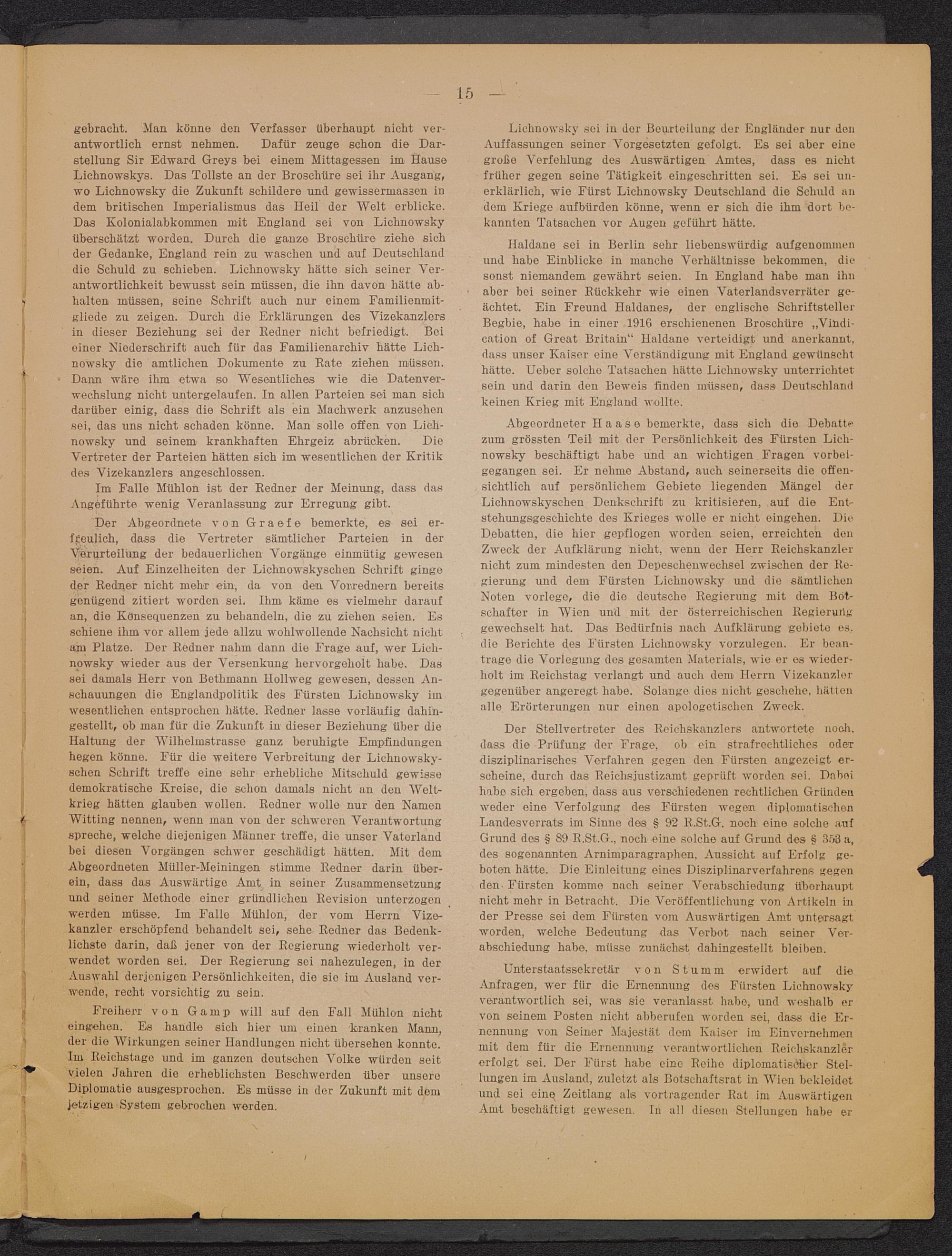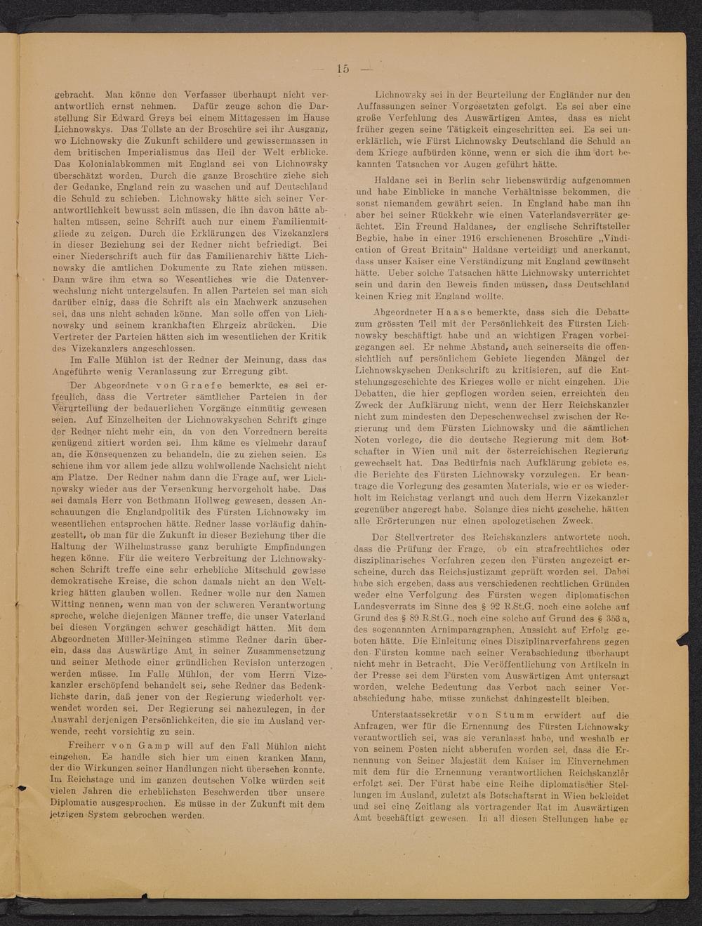 Unterstaatssekretär von Stumm erwidert auf dieAnfragen, wer für dio Ernennung des Fürsten Lichnowskyverantwortlich sei, was sie veranlasst habe, und weshalb ervon seinem Posten nicht abberufen worden sei, dass die Er-nennung von Seiner Majestät dem Kaiser im Einvernehmenmit dem für die Ernennung verantwortlichen Reichskanzlererfolgt sei. Der Fürst habe eine Reihe diplomatischer Stel-lungen im Ausland, zuletzt als Botschaftsrat in Wien bekleidetund sei eine, Zeitlang als Vortragender Rat im AuswärtigenAmt beschäftigt gewesen, ln all diesen Stellungen habe er
