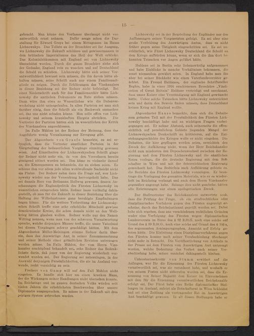 gliede zu zeigen. Durch die Erklärungen des Vizekanzlersin dieser Beziehung sei der Redner nicht befriedigt. Beioiner Niederschrift auch für das Familienarchiv hätte Lich-nowsky die amtlichen Dokumente zu Rate ziehen müssen.1 • Dann wäre ihm etwa so Wesentliches wie die Datenver-