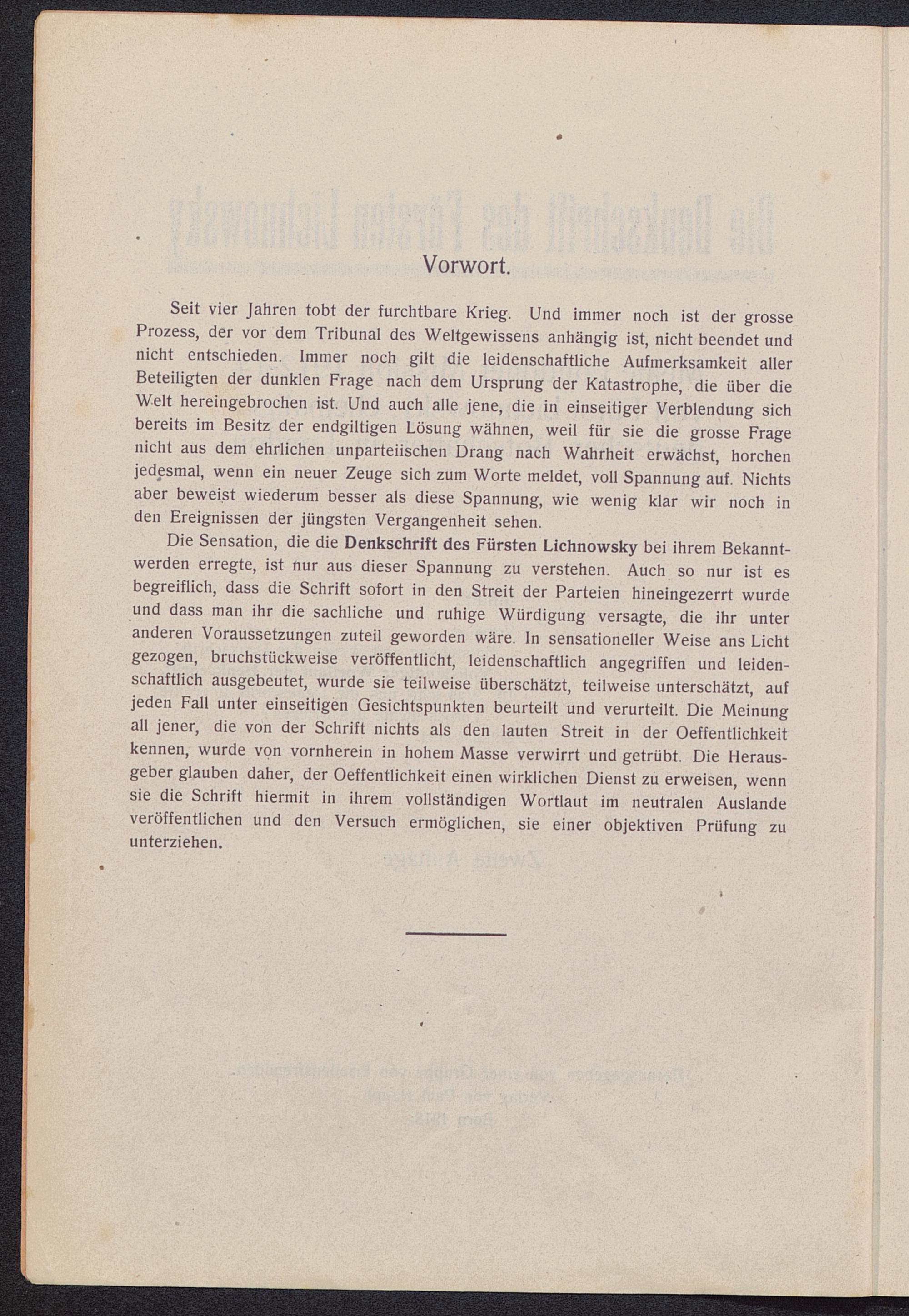 Seit vier Jahren tobt der furchtbare Krieg. Und immer noch ist der grosseProzess, der vor dem Tribunal des Weltgewissens anhängig ist, nicht beendet undnicht entschieden. Immer noch gilt die leidenschaftliche Aufmerksamkeit allerBeteiligten der dunklen Frage nach dem Ursprung der Katastrophe, die über dieWelt hereingebrochen ist. Und auch alle jene, die in einseitiger Verblendung sichbereits im Besitz der endgiltigen Lösung wähnen, weil für sie die grosse Fragenicht aus dem ehrlichen unparteiischen Drang nach Wahrheit erwächst, horchenjedesmal, wenn ein neuer Zeuge sich zum Worte meldet, voll Spannung auf. Nichtsaber beweist wiederum besser als diese Spannung, wie wenig klar wir noch inden Ereignissen der jüngsten Vergangenheit sehen.