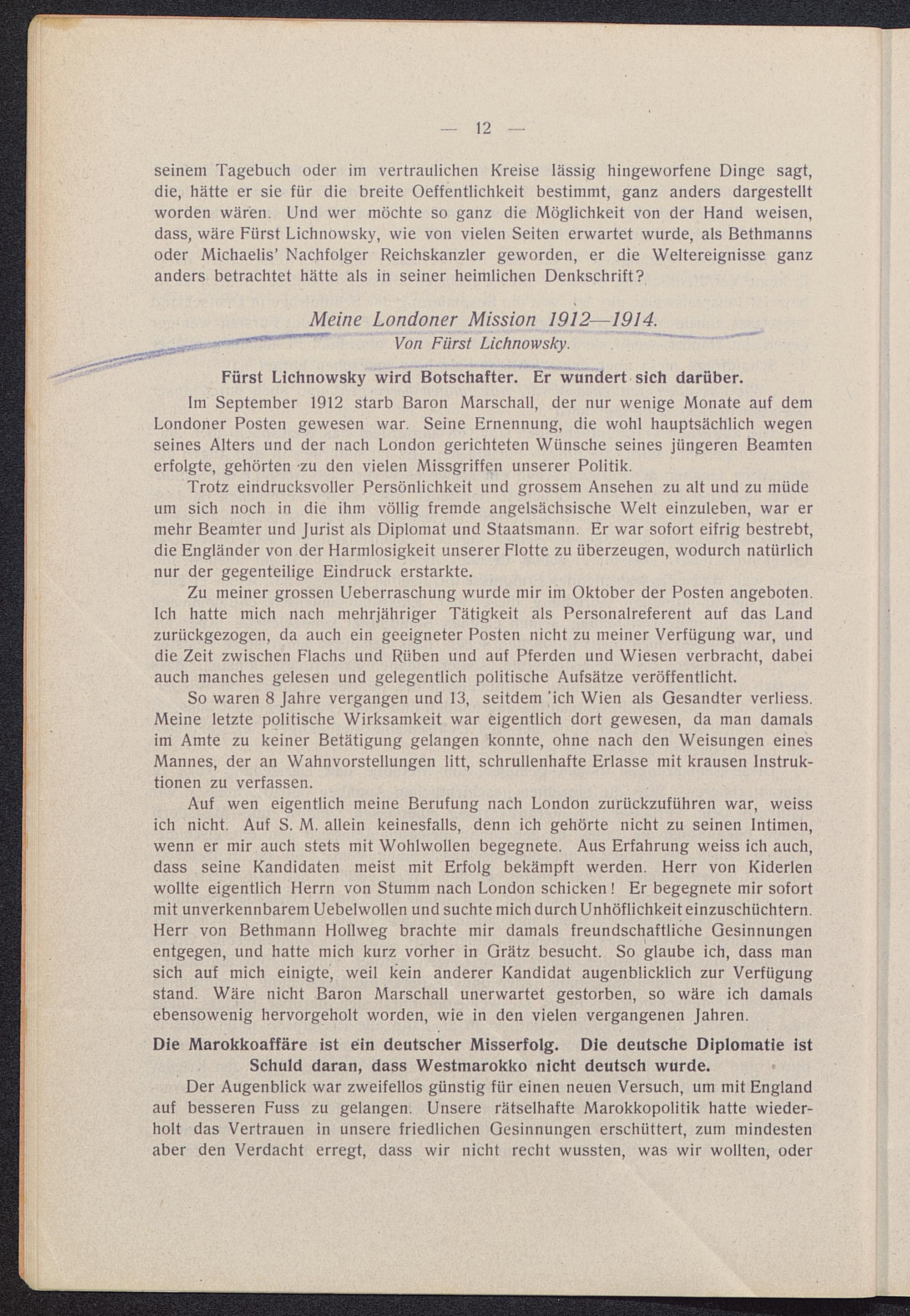 Auf wen eigentlich meine Berufung nach London zurückzuführen war, weissich nicht. Auf S. M. allein keinesfalls, denn ich gehörte nicht zu seinen Intimen,wenn er mir auch stets mit Wohlwollen begegnete. Aus Erfahrung weiss ich auch,dass seine Kandidaten meist mit Erfolg bekämpft werden. Herr von Kiderlenwollte eigentlich Herrn von Stumm nach London schicken ! Er begegnete mir sofortmit unverkennbarem Uebelwollen und suchte mich durch Unhöflichkeit einzuschüchtern.Herr von Bethmann Hollweg brachte mir damals freundschaftliche Gesinnungenentgegen, und hatte mich kurz vorher in Grätz besucht. So glaube ich, dass mansich auf mich einigte, weil kein anderer Kandidat augenblicklich zur Verfügungstand. Wäre nicht Baron Marschall unerwartet gestorben, so wäre ich damalsebensowenig hervorgeholt worden, wie in den vielen vergangenen Jahren.
