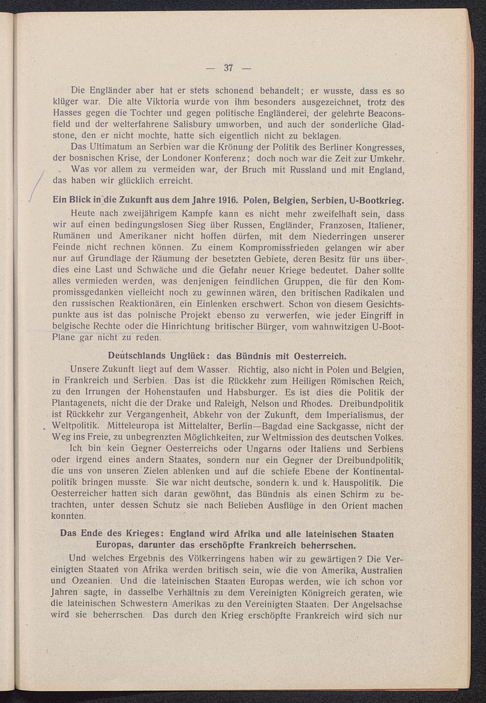 Heute nach zweijährigem Kampfe kann es nicht mehr zweifelhaft sein, dasswir auf einen bedingungslosen Sieg über Russen, Engländer, Franzosen, Italiener ,Rumänen und Amerikaner nicht hoffen dürfen, mit dem Niederringen unsererFeinde nicht rechnen können. Zu einem Kompromissfrieden gelangen wir abernur auf Grundlage der Räumung der besetzten Gebiete, deren Besitz für uns über-,dies eine Last und Schwäche und die Gefahr neuer Kriege bedeutet. Daher solltealles vermieden werden, was denjenigen feindlichen Gruppen, die für den Kom-promissgedanken vielleicht noch zu gewinnen wären, den britischen Radikalen undden russischen Reaktionären, ein Einlenken erschwert. Schon von diesem Gesichts-punkte aus ist das polnische Projekt ebenso zu verwerfen, wie jeder Eingriff inbelgische Rechte oder die Hinrichtung britischer Bürger, vom wahnwitzigen U-Boot-Plane gar nicht zu reden.