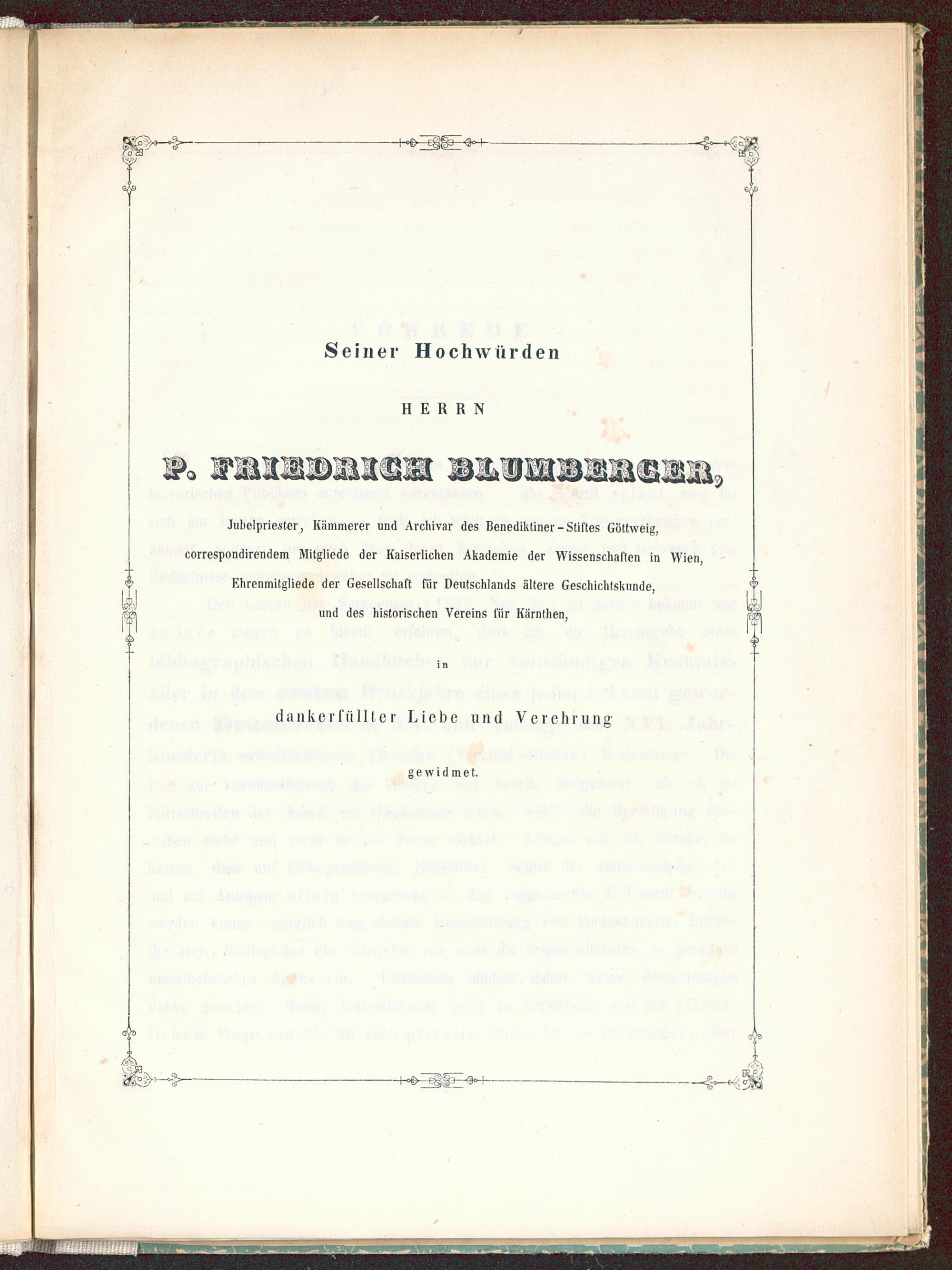 Jubelpriester, Kämmerer und Archivar des Benediktiner - Stiftes Göttweig ,correspondirendem Mitgliede der Kaiserlichen Akademie der Wissenschaften in Wien ,Ehrenmitgliede der Gesellschaft für Deutschlands ältere Geschichtskunde,und des historischen Vereins für Kärnthen,