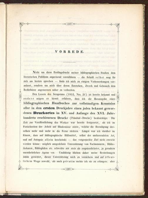 Nicht um diese Erstlingsfrucht meiner bibliographischen Studien demliterarischen Publikum anpreisend vorzuführen — die Schrift selbst mag fürsich am besten sprechen — finde ich mich zu einigen Vorbemerkungen ver-anlasst, sondern um mich über deren Entstehen, Zweck und Gebrauch demBedürfnisse angemessen näher zu verbreiten.