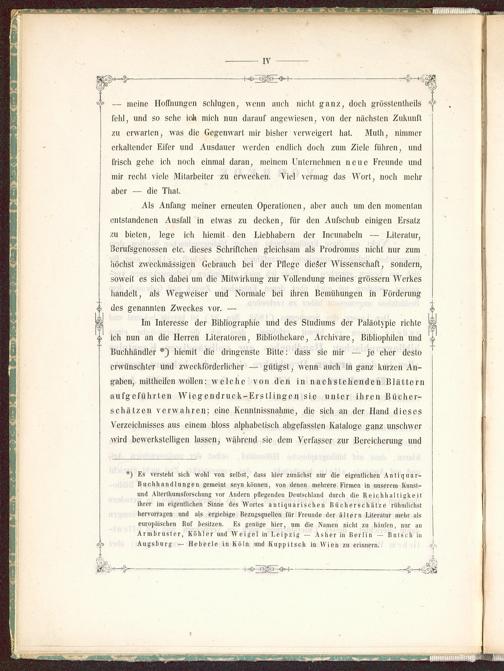 Im Interesse der Bibliographie und des Studiums der Paläotypic richteich nun an die Herren Literalorcn, Bibliothekare, Archivare, Bibliophilen undBuchhändler *) hiemit die dringenste Bitte: dass sie mir ■ — je eher destoerwünschter und zwcckfördcrlichcr — gütigst , wenn auch in ganz kurzen An-gaben, mittheilen wollen: welche von den in nachstehenden Blätternaufgeführten Wiegendruck-Erstlingen sie unter ihren Bücher-schätzen verwahren; eine Kcnnlnissnahme, die sich an der Hand diesesVerzeichnisses aus einem bloss alphabetisch abgefassten Kataloge ganz unschwerwird bewerkstelligen lassen, während sie dem Verfasser zur Bereicherung und