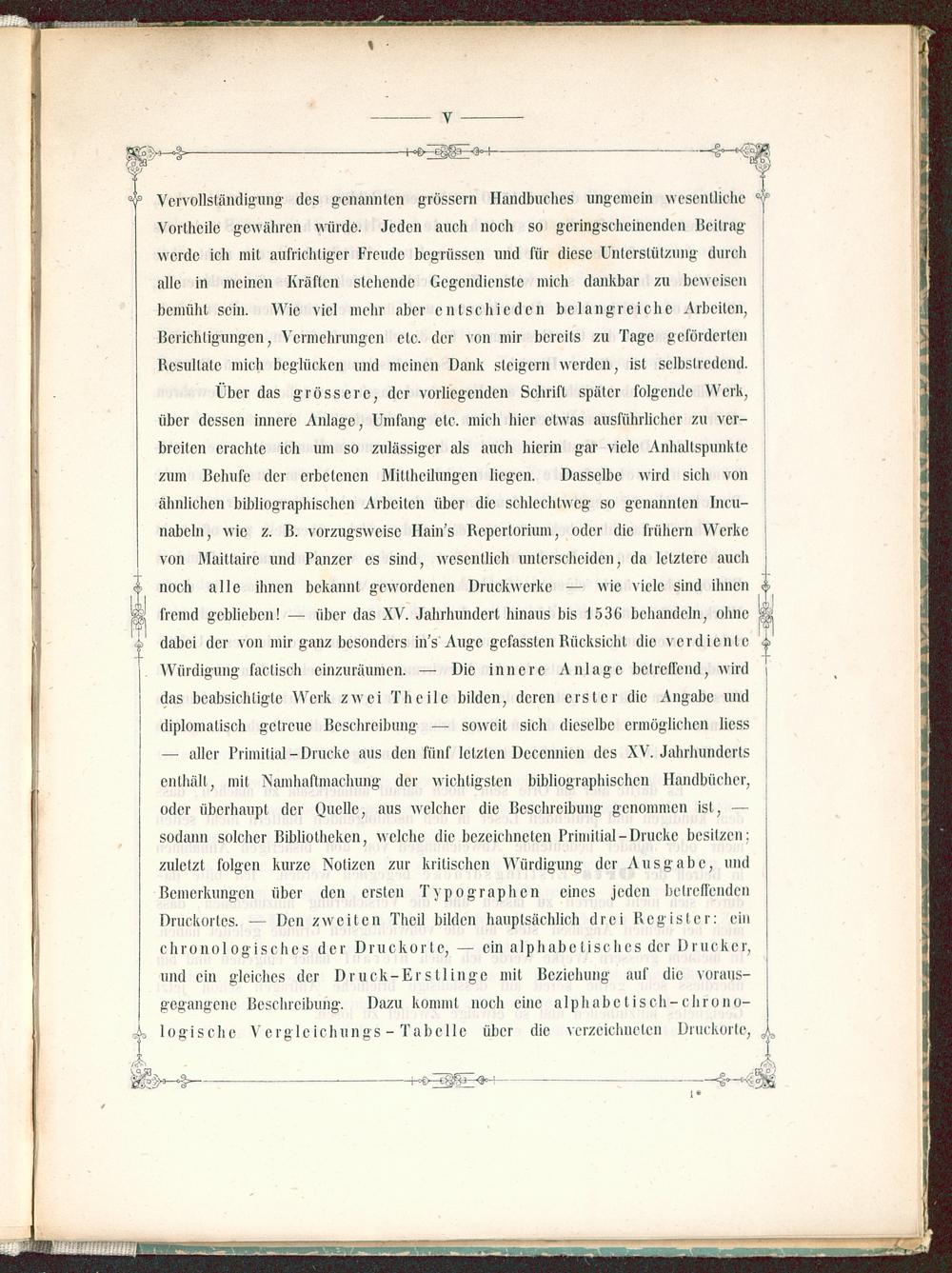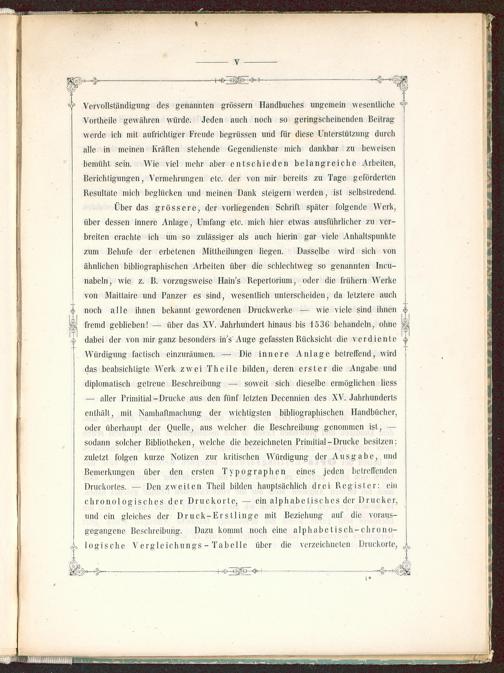 Über das grössere, der vorliegenden Schrift später folgende Werk,über dessen innere Anlage, Umfang etc. mich hier etwas ausführlicher zu ver-breiten erachte ich um so zulässiger als auch hierin gar viele Anhaltspunktezum Bchufe der erbetenen Millhcilungen liegen. Dasselbe wird sich vonähnlichen bibliographischen Arbeiten über die schlechtweg so genannten Ineu-nabcln, wie z. B. vorzugsweise Hain's Beperlorium, oder die frühern Werkevon Maittairc und Panzer es sind, wesentlich unterscheiden, da letztere auchnoch alle ihnen bekannt gewordenen Druckwerke — wie viele sind ihnenfremd geblieben! — über das XV. Jahrhundert hinaus bis 1536 behandeln, ohnef dabei der von mir ganz besonders in's Auge gcfasslcn Rücksicht die verdienteWürdigung factisch einzuräumen. — Die innere Anlage betreffend, wirddas beabsichtigte Werk zwei Thcilc bilden, deren erster die Angabe unddiplomatisch getreue Beschreibung — soweit sich dieselbe ermöglichen Hess— aller Primitial-Drucke aus den fünf letzten Deccnnien des XV. Jahrhundertsenthält, mit Namhaftmachung der wichtigsten bibliographischen Handbücher,oder überhaupt der Quelle, aus welcher die Beschreibung genommen ist, —sodann solcher Bibliotheken, welche die bezeichneten Primilial-Drucke besitzen:zuletzt folgen kurze Notizen zur kritischen Würdigung der Ausgabe, undBemerkungen über den ersten Typographen eines jeden betreffendenDruckortes. — Den zweiten Theü bilden hauptsächlich drei Register: einchronologisches der Druckortc, — ein alphabetisches der Drucker,und ein gleiches der Druck-Erstlinge mit Beziehung auf die voraus-gegangene Beschreibung. Dazu kommt noch eine alphabc tisch-chrono-X logische Vergicichungs - Tabelle über die verzeichneten Dnickorlc,1