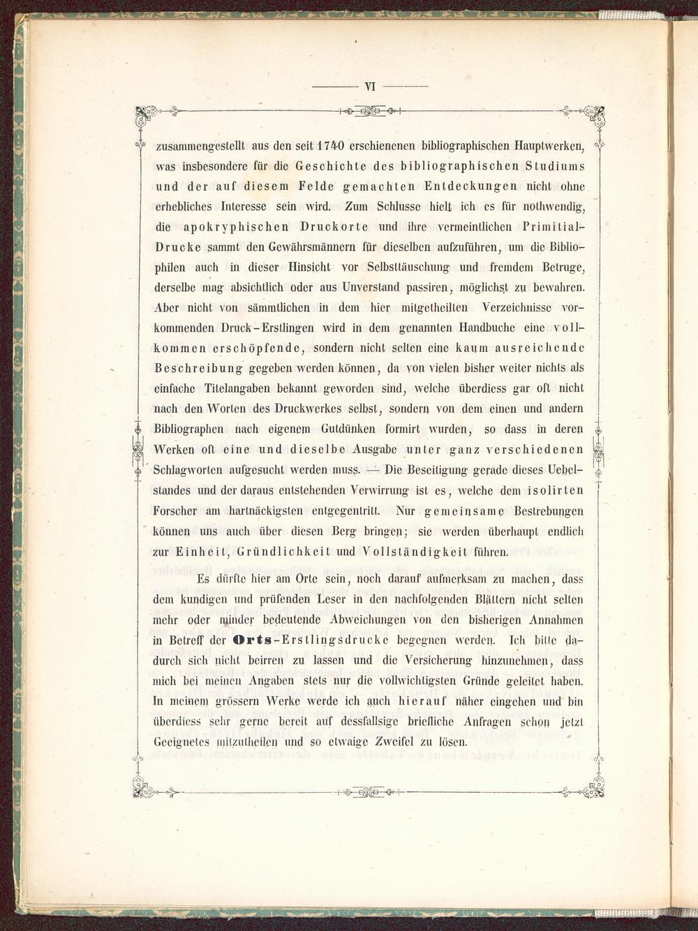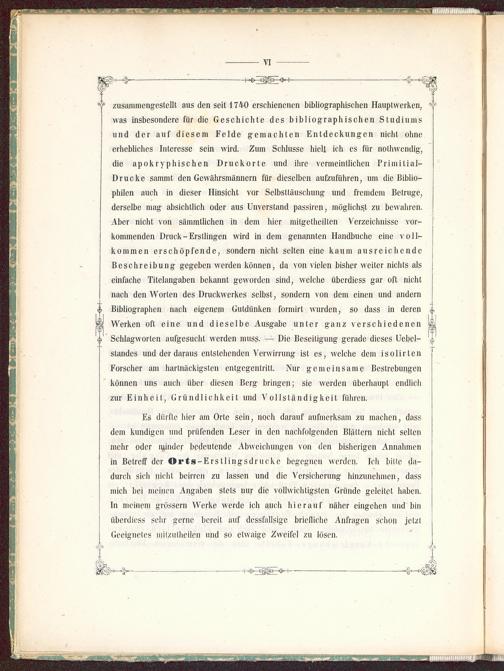 Es dürfte hier am Orte sein, noch darauf aufmerksam zu machen, dassdem kundigen und prüfenden Leser in den nachfolgenden Blättern nicht seltenmehr oder minder bedeutende Abweichungen von den bisherigen Annahmenin Betreff der Orts-Erstlingsdrucke begegnen werden. Ich bitte da-durch sich nicht beirren zu lassen und die Versicherung hinzunehmen, dassmich bei meinen Angaben stets nur die vollwichtigsten Gründe geleitet haben.In meinem grössern Werke werde ich auch hierauf näher eingehen und binüberdiess sehr gerne bereit auf dcssfallsige briefliche Anfragen schon jetzt