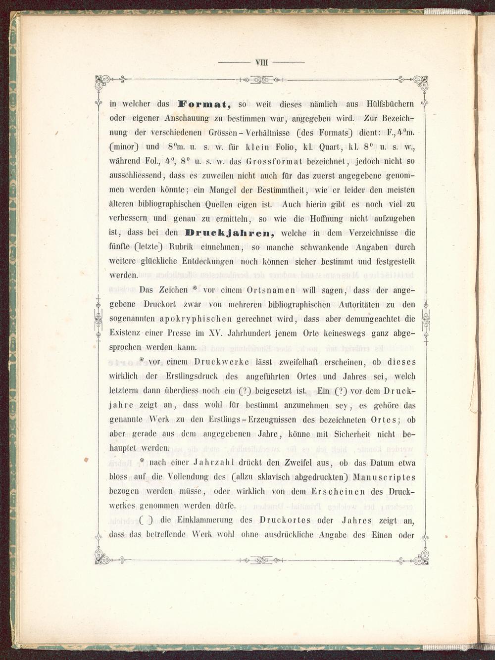 in welcher das Format, so weit dieses nämlich aus Hülfsbüchern a joder eigener Anschauung- zu bestimmen war, angegeben wird. Zur Bezeich-nung der verschiedenen Grössen-Verhältnisse (des Formats) dient: F.,4°m.(minor) und 8°m. u. s. w. für klein Folio, kl. Quart, kl. 8° u. s. w.,während Fol., 4°, 8° u. s. w. das Grossformat bezeichnet, jedoch nicht soausschliesscnd, dass es zuweilen nicht auch für das zuerst angegebene genom-men werden könnte; ein Mangel der Bestimmtheit, wie er leider den meistenälteren bibliographischen Quellen eigen ist, Auch hierin gibt es noch viel zuverbessern und genau zu ermitteln, so wie die Hoffnung nicht aufzugebenist, dass bei den Druck jähren, welche in dem Verzeichnisse diefünfte (letzte) Rubrik einnehmen, so manche schwankende Angaben durchweitere glückliche Entdeckungen noch können sicher bestimmt und festgestelltwerden.
