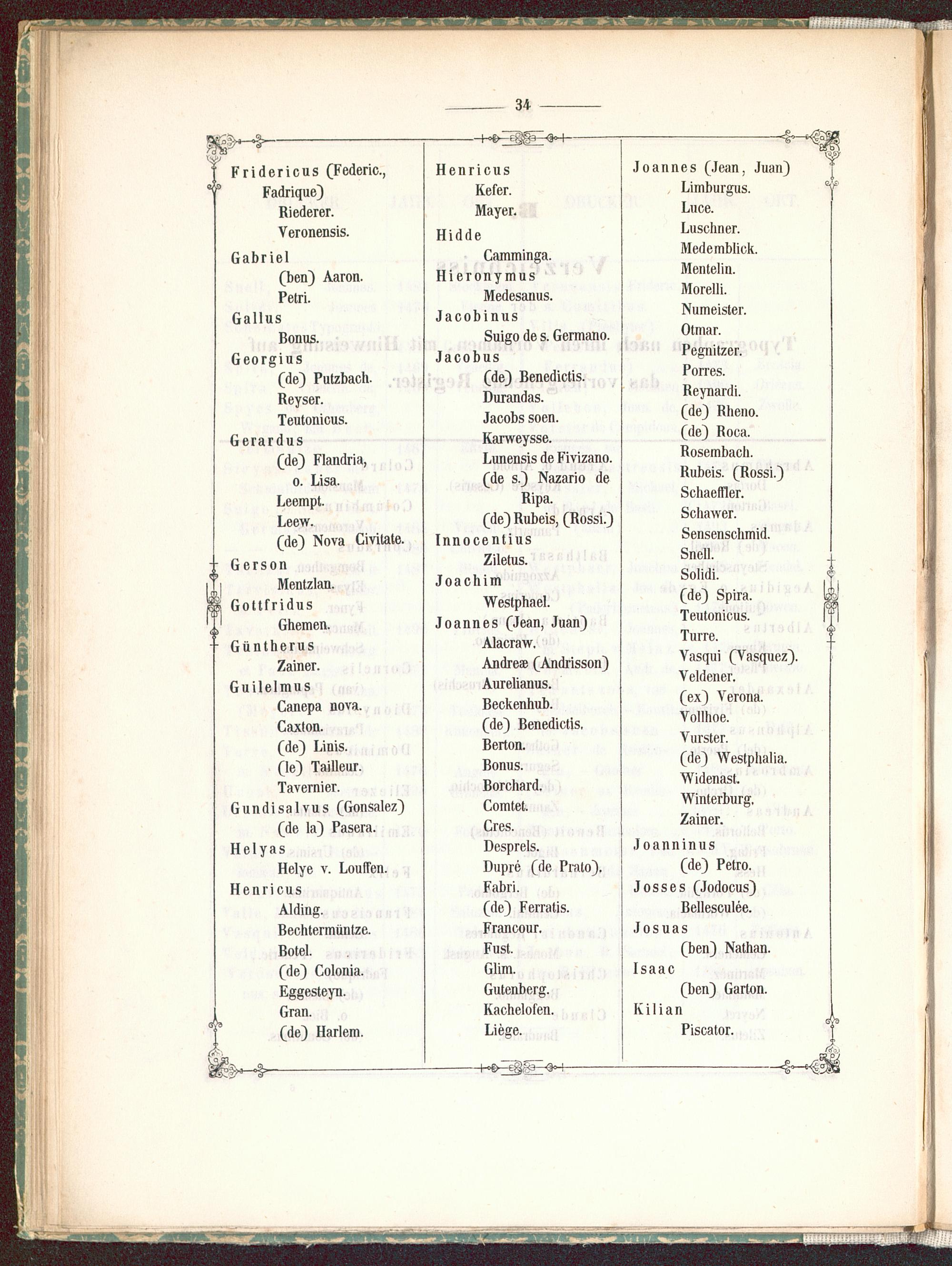 Joannes (Jean, Juan)Limburgus.Luce.Luschner.Medemblick.Mentelin.Morelli.Numeister.Otmar.Pegnitzer.Porres.Reynardi.(de) Rheno.(de) Roca.Rosembach.Rubeis. (Rossi.)Schaefller.Schawer.Sensenschmid.Snell.Solidi.(de) Spira.Teutonicus.Turre.