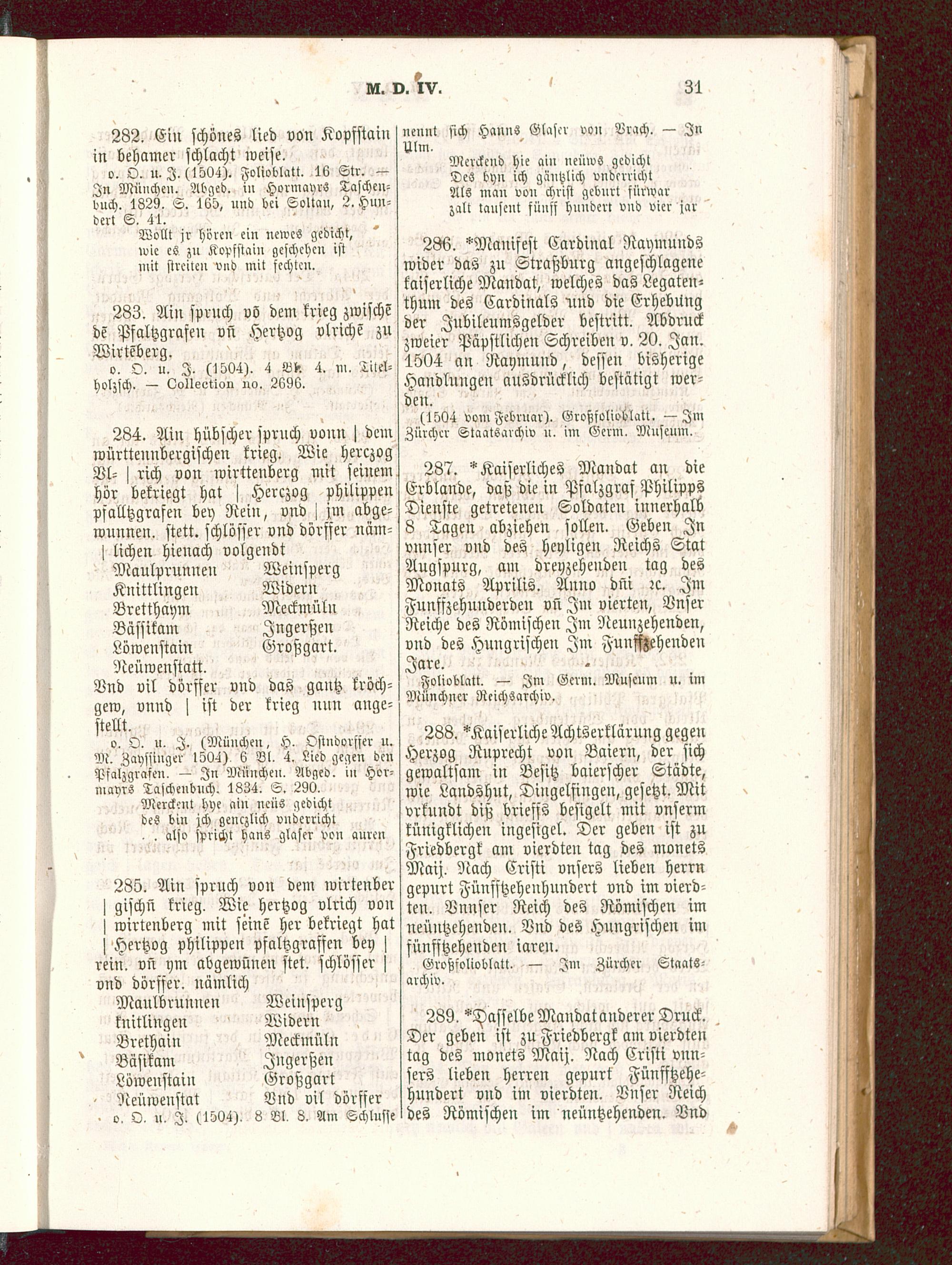 287. "Kaiserliches Mandat an dieErvlande, daß die in Pfalzgraf PhilippsDienste getretenen Soldaten innerhalb8 Tagen abziehen sollen. Geben Invnnser vnd des heyligen Reichs StatAugspurg, am dreiizeheuden tag desMonats Aprilis. Anno dni :c. JmFunffzehunderden vn Jm vierten, VnserReiche des Römischen Jm Neuuzehenden,vnd des Hungrischen Jm FunMehendenJare.