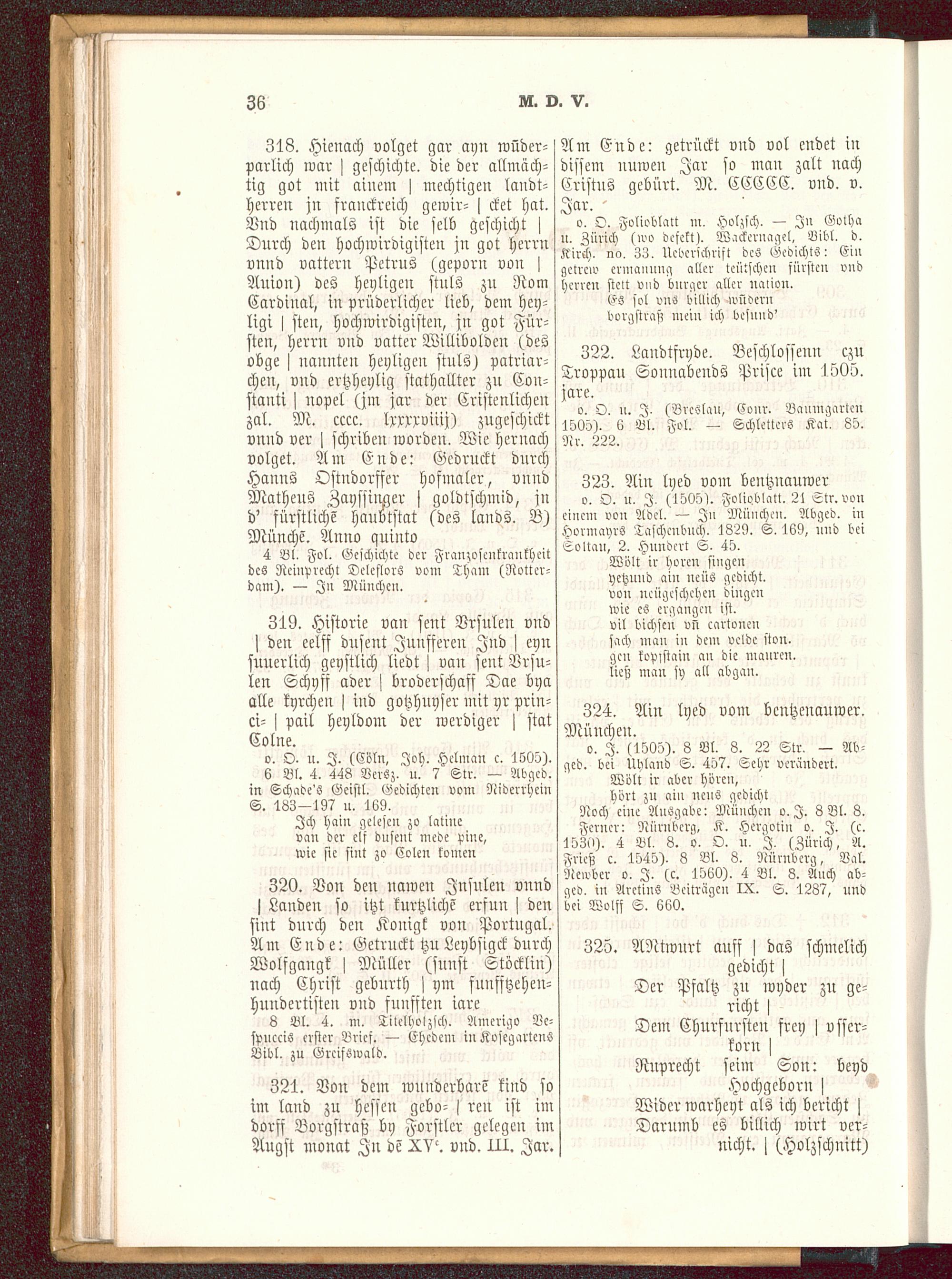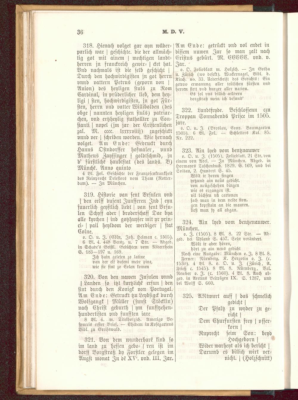 318. Hienach volget gar ann wllder-parlich war > geschichte. die der allmäch-tig got mit aincm j mechtigen landt-herren jn franckreich gewir- j cket hat.Vnd nachmals ist die selb geschieht >Durch den hochwirdigisten jn got Herrnvnnd vattern Petrus (geporn von jAuion) des heyligeu stuls zu Rom Cardinal, in vrüderlicher lieb, dem hen-ligi > sten, hochwirdigisten, jn got Für-sten, Herrn vnd vatter Willibalden (desobge j nannten heyligen stuls) Patriar-chen, vnd ertzheulig stathallter zu Con-stanti j uopel (jm jar der Cristenlichenzal. M. cccc. lrrrrviiij) zugeschicktvnnd ver I schriben worden. Wie hernachvolget. Am Ende: Gedruckt durchHanns Ostndorffer Hofmaler, vnndMatheus Zayssinaer > goldtschmid, jnd' fürstliche haubtstat (des lands. B)Münche . Anno quinto