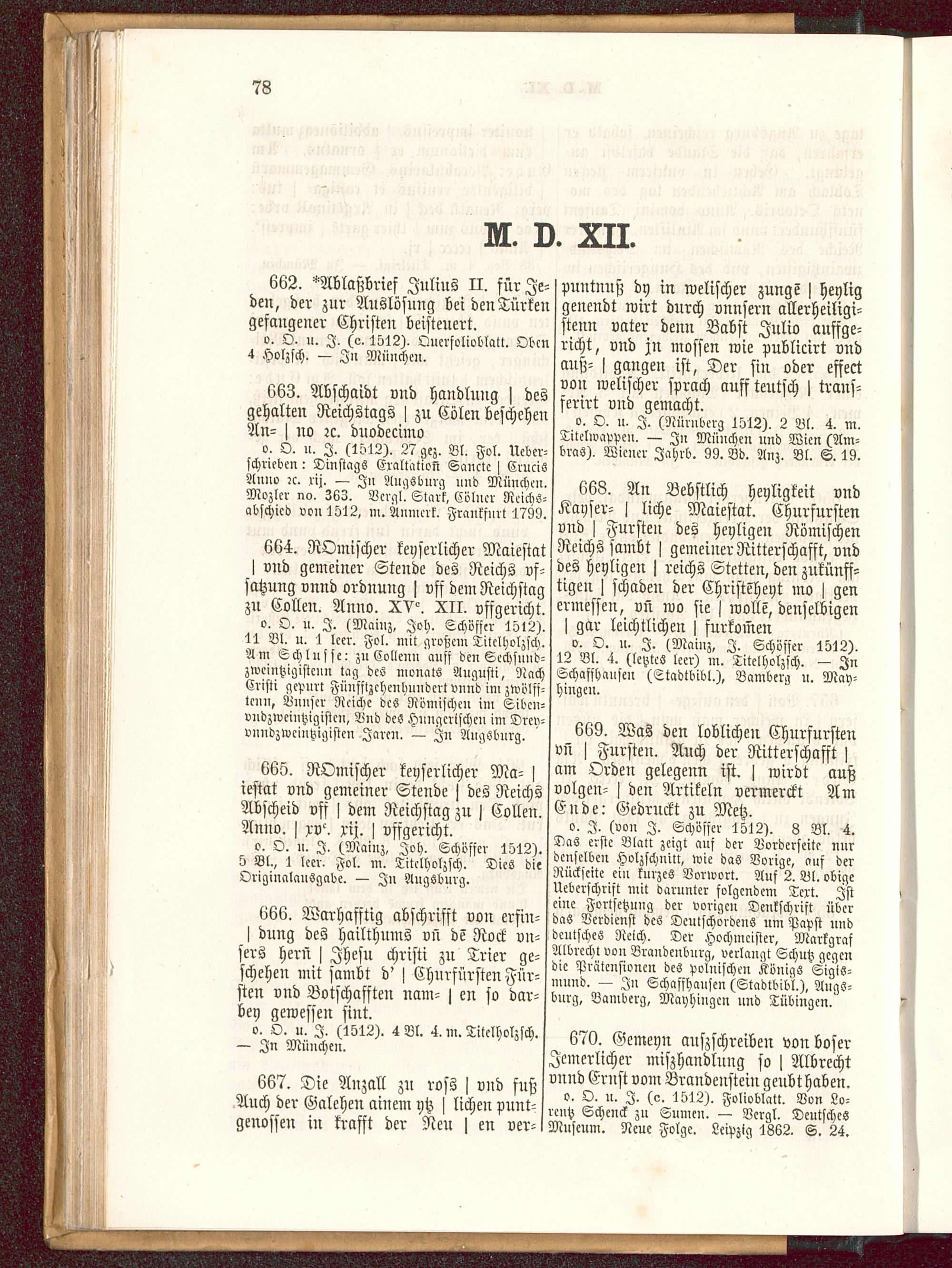 o. O. u. I. (Mainz . Joh. Cchöfser 1512).11 Bl. u. 1 leer. Fol. mit großem Titelholzsch.Am Schlüsse: zn Collenn ausf den Sechsnnd-zweintzigistenn tag des nionats Angusti, NachCristi gepurt Füufftzcheuhuudcrt vnnd im zwölsf-lcnn, Vnnscr Reiche des Römischen im Sidcn-vndzwcintzigistcn, Nnd des Hnngcrischen im Drey-vnndzwcintzigistcn Jarcn. — In AngSburg.