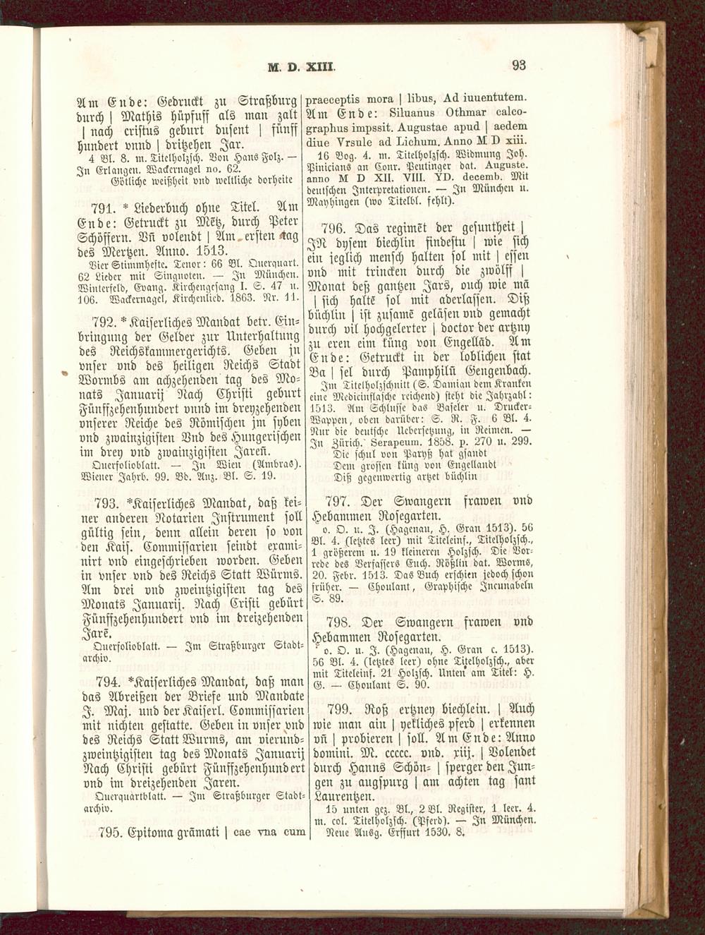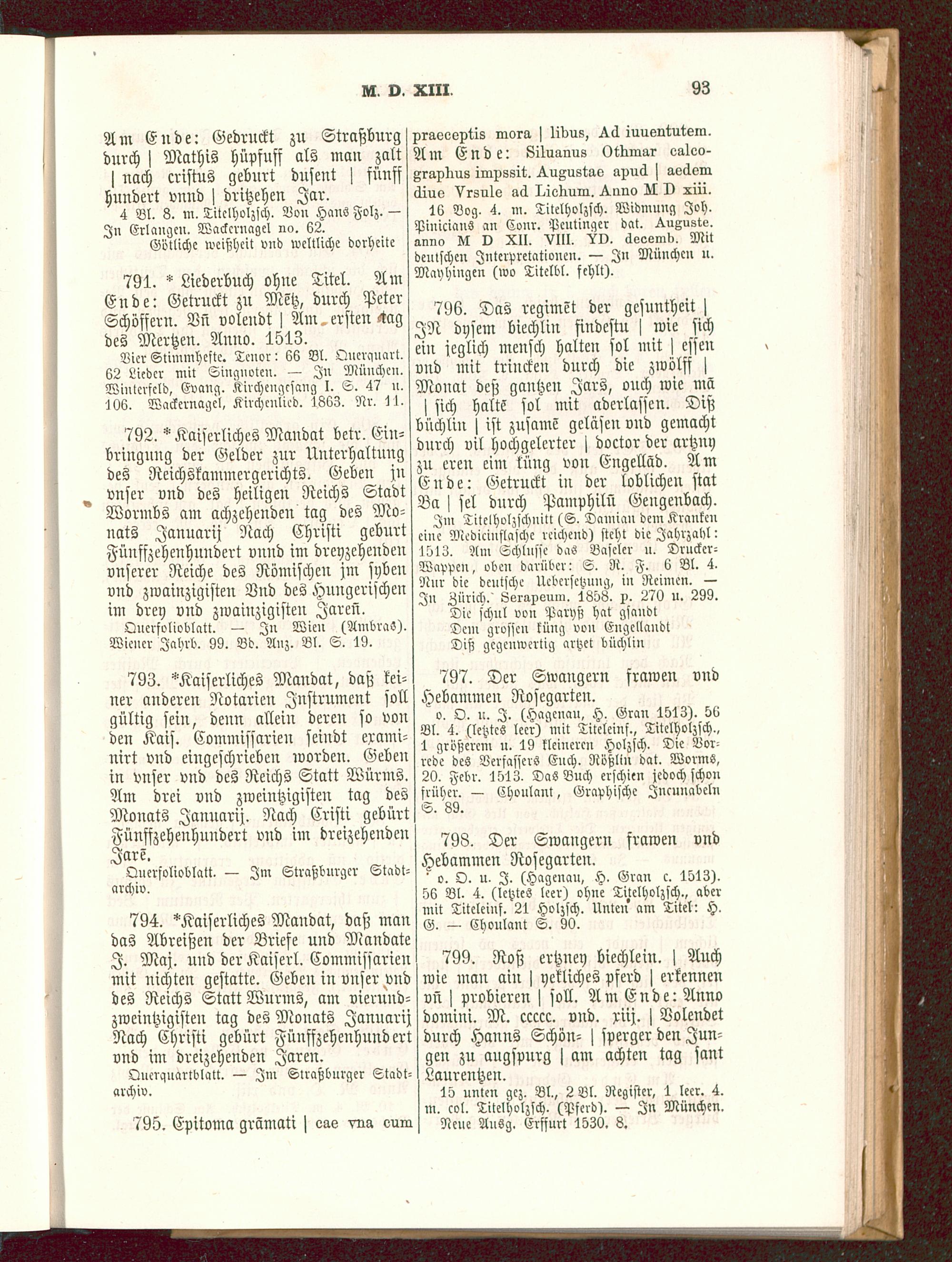 794. "Kaiserliches Mandat, daß mandas Abreißen der Briefe und MandateI. Maj. und der Kaiserl. Commissarienmit uichten gestatte. Geben in vnser vnddes Reichs Statt Wurms, am vierund-zweintzigisten tag des Monats JanuarijNach Christi gebürt Fünffzehenhundertvnd im dreizehenden Jaren.