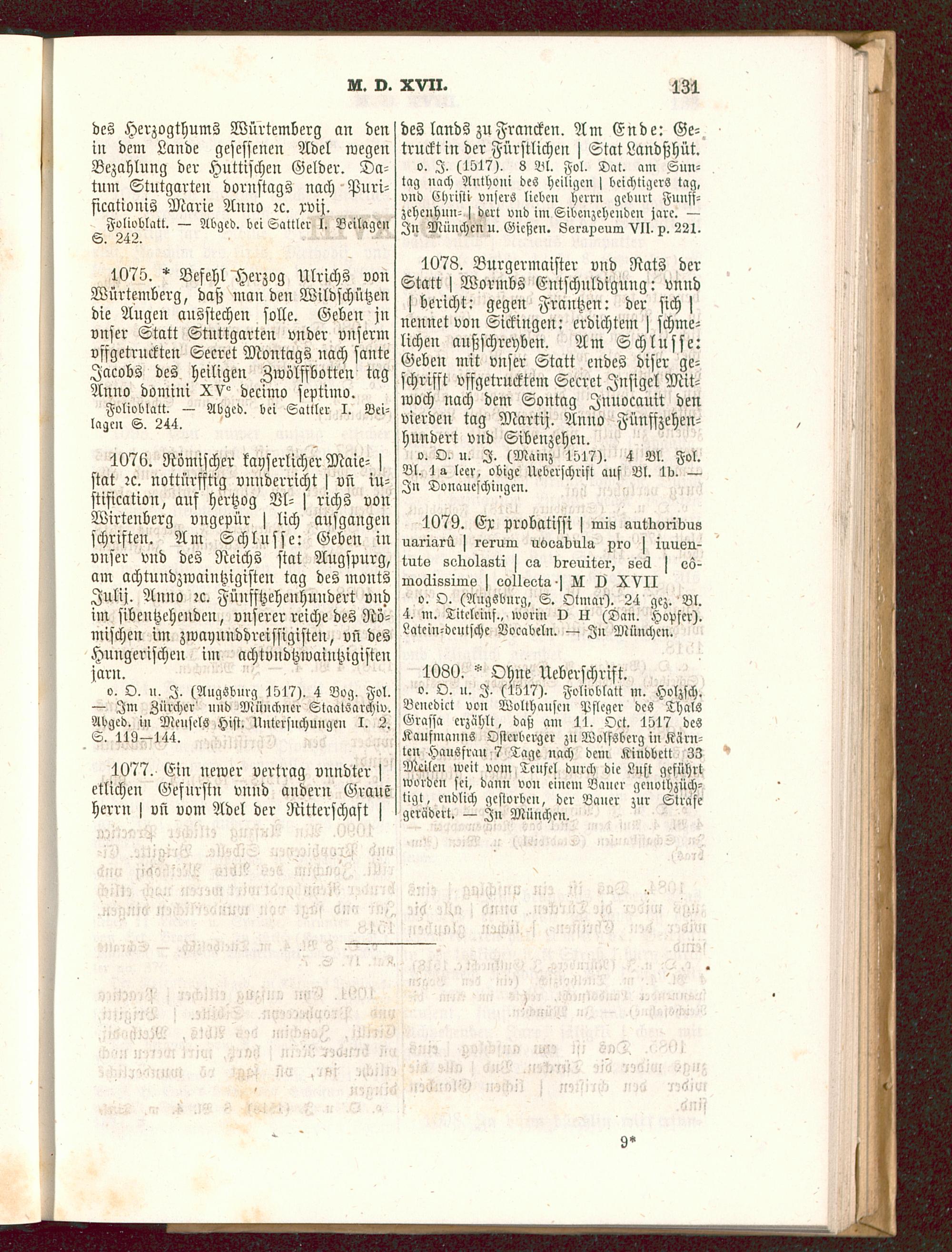 1075. * Befehl "Herzog Ulrichs vonWürtemberg, daß man den Wildschützendie Augen ausstechen solle. Geben jnvnser Statt Stuttgarten vnder unsermvfsgetruckten Secret Montags nach santeJacobs des heiligen Zwölffbotten tagAnno domini XV° decimo scptimo.