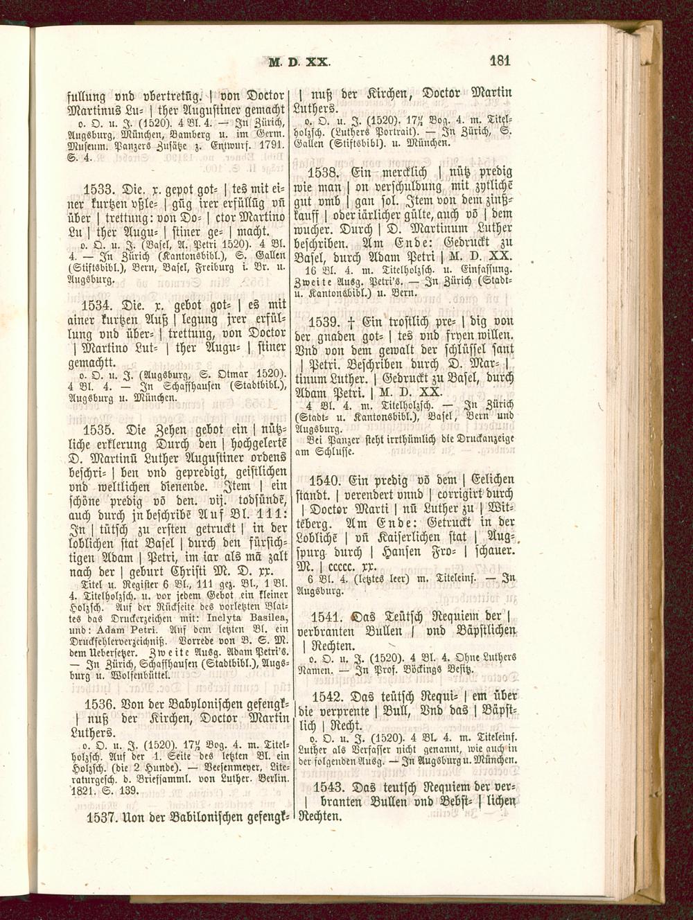 1535. Die Zehen gebot ein I nütz-liche erklerung Durch den > hochgelerteD. MartinQ Luther Augustiner ordensbeschri- j ben vnd gepredigt, geistlichenvnd weltlichen dienende. Item j einschöne predig vö den. vij. todsünde,auch durch jnbeschribe Auf Bl. 111:In j tütsch zn ersten getruckt j in derloblichen stat Basel j durch den fürsich-tigen Adam j Petri, im iar als mä zaltnach der j geburt Christi M. D. xx.