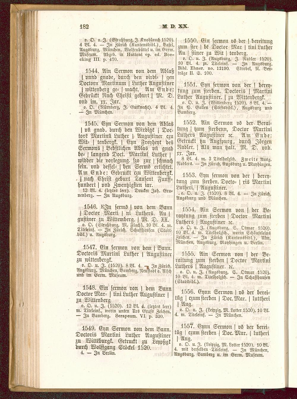 1552. Ain Sermon vö der -Berai-tung j tzum sterbenn, Doctor MartiniLuthers Augustiner :c. Am Ende:Getrnckt tzu Augspurg , durch JörgenNadler. > Als man tzalt. M. D. vnd.rr. Jar.