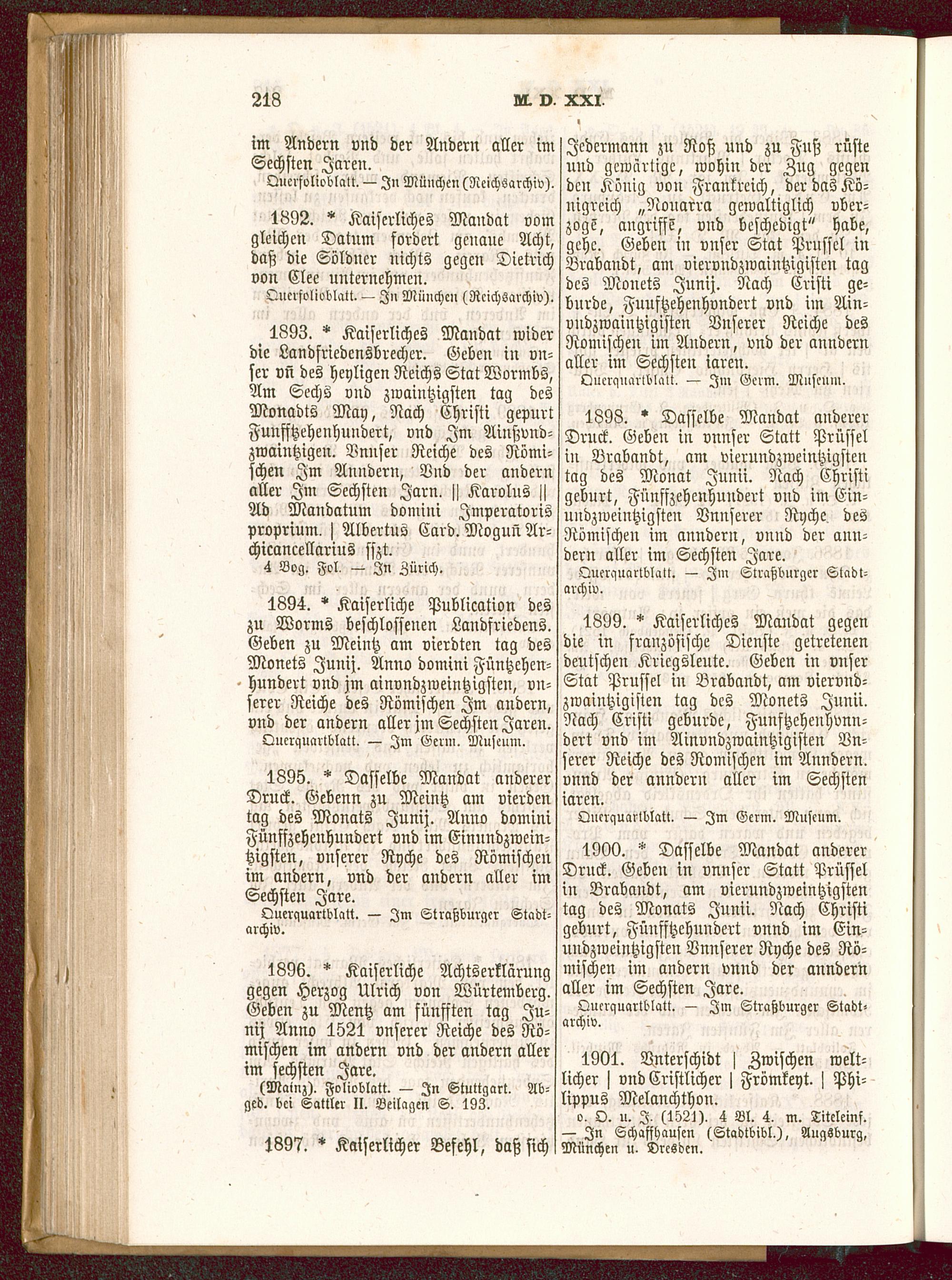 1895. * Dasselbe Mandat andererDruck. Gebenn zu Meintz am vierdentag des Monats Junij . Anno dominiFünffzehenhundert vnd im Einundzwein-tzigsten, vnserer Ryche des Römischenim andern, vnd der andern aller imSechsten Jare.