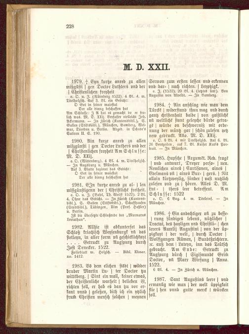 o. O. u. I. (Nürnberg 1522), 4 Bl. 4. m,Titelholzsch. Auf 3. Bl, ein Gedicht:O Got in seiner maiestatDer alle dinng beschaffen hatAm Schlüsse- I A hat es gemacht do er fro-lich was, M. D, XXij, Verfasser vielleicht Job.Ackermann. — In Zürich (Kantvnsbibl,), S,Gallen (Stiftsbibl.), München, Bambcrg, Wei-mar, Dresden n. Berlin . Adged. in Sck'ade'öSatiren II. S. 190,