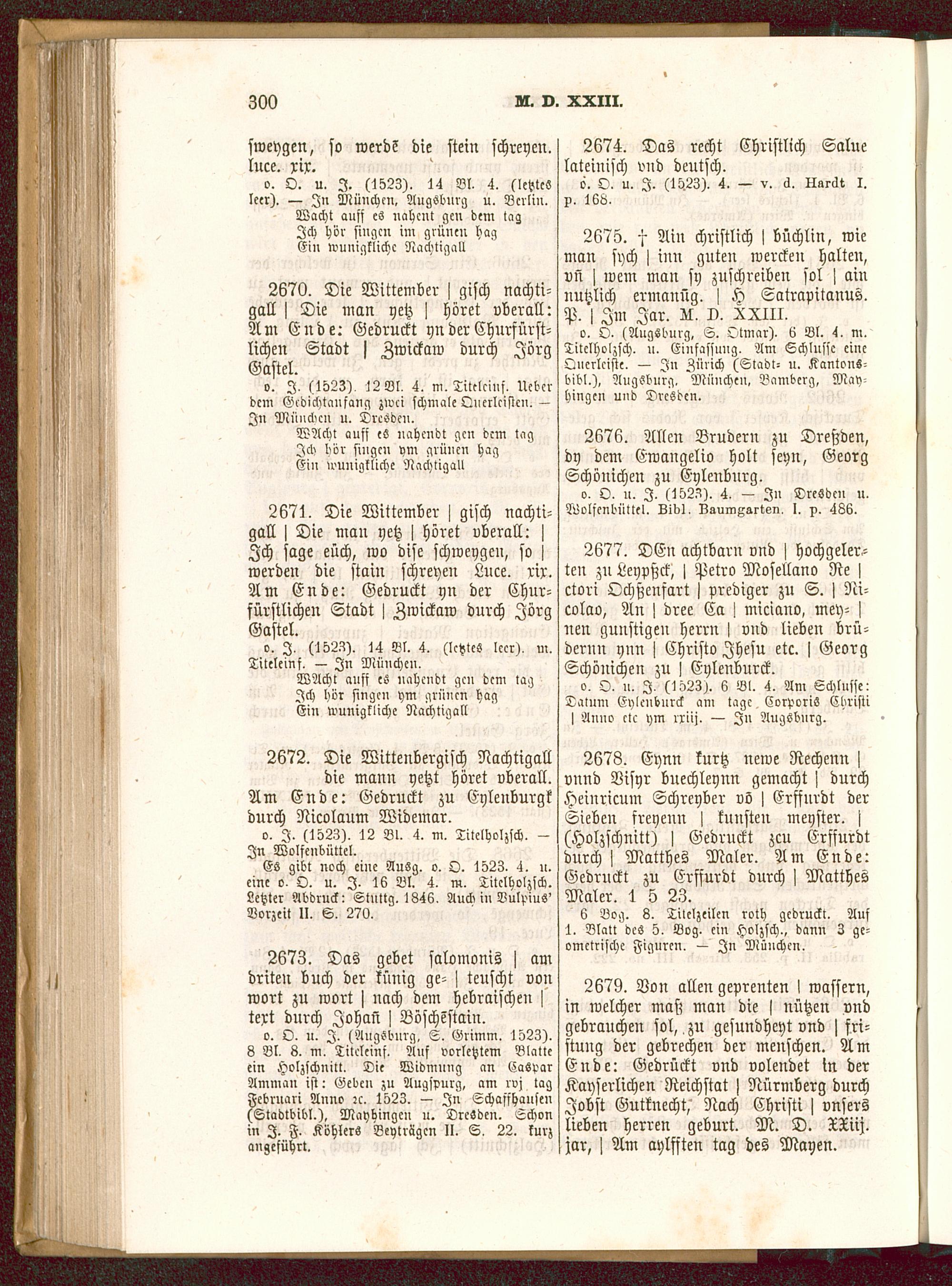 2671. Die Wittember j gisch Nachti-gall > Die man netz j höret überall: jIch sage euch, wo dise schweygen, so >werden die stain schreyen Luce. rix.Am Ende: Gedruckt yn der Chur-fürstlichen Stadt j Zwickaw durch JörgGastel.