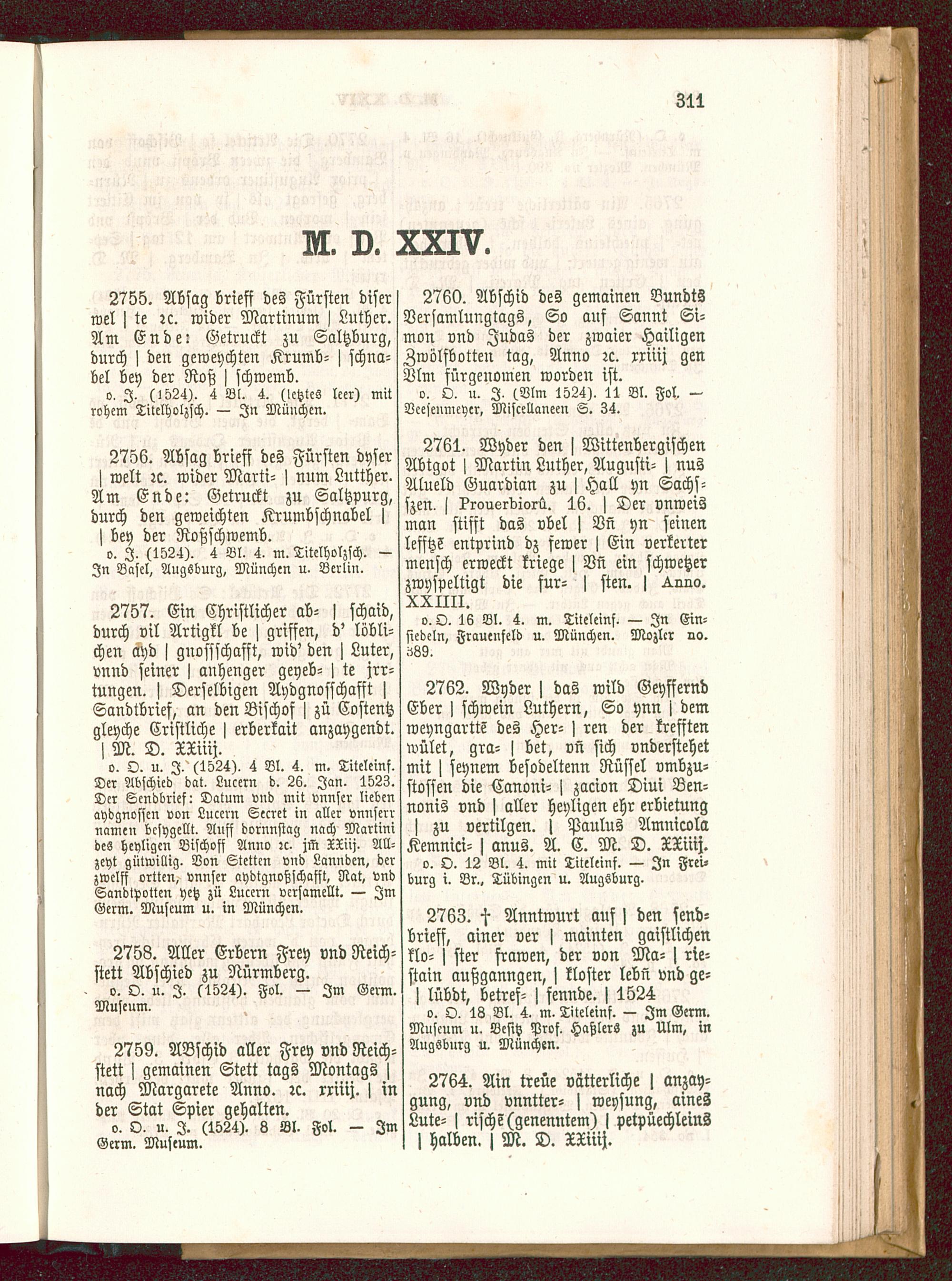 o. O. u. I, (1524), 4 Bl. 4. m. Titeleinf.Der Abschied bat. Lucern d. 26. Jan. 1523.Der Sendbrief: Datum vnd mit vnnser liebenaydgnossen von Luccrn Secret in aller vnnserrnamen bcsygellt. Aufs dornnstag nach Martinides heyligen Bischofs Anno :c- jM XXiij. All-zeyt gütwillig. Von Stettcn vnd Lannden, derzwelfs ortten, vnnser aydtgnoßschafst, Rat, vndSandtvotten yetz zü Luccrn vcrsamellt. — ImGerm. Museum u. in München .