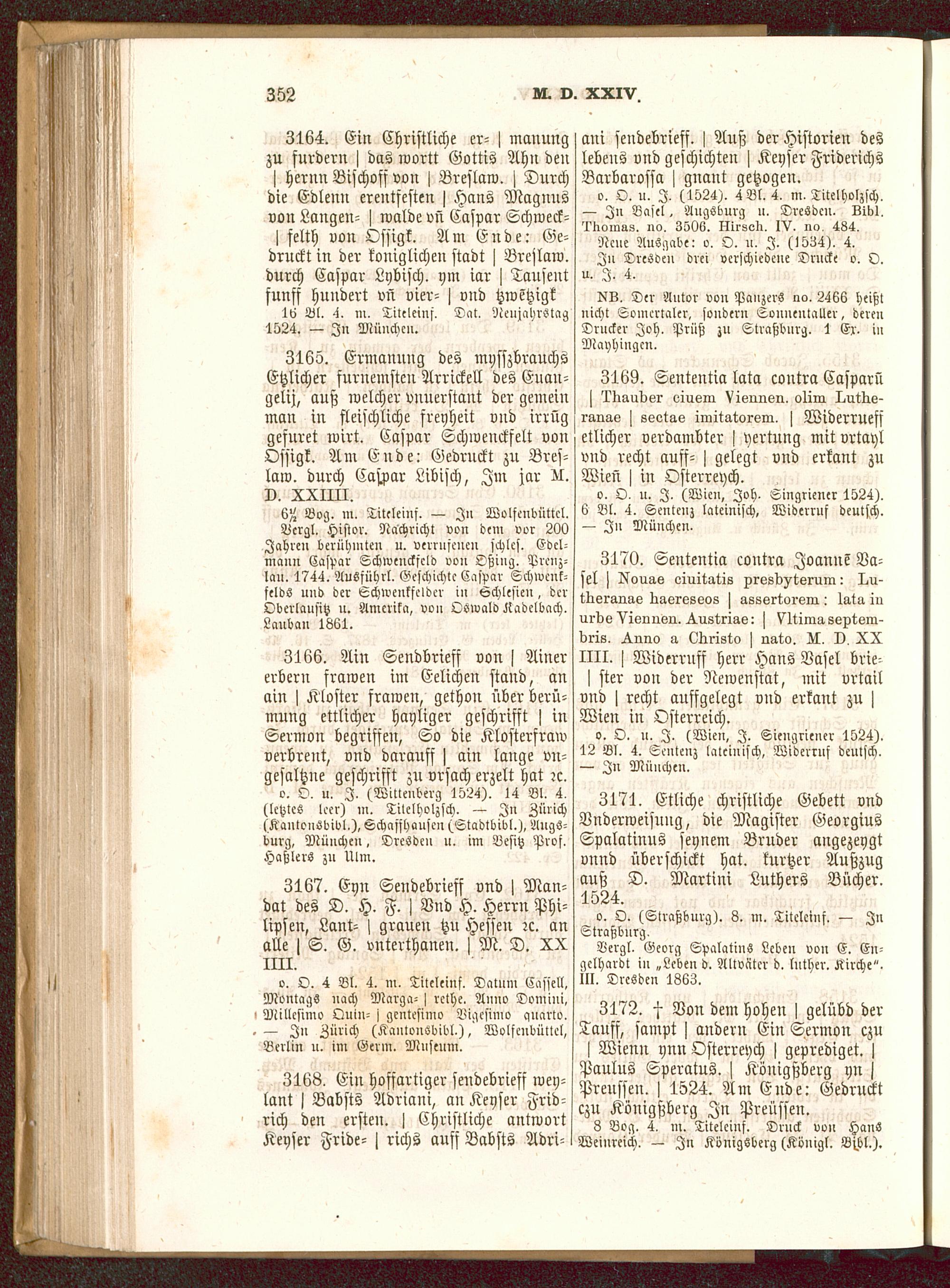 3165. Ermanung des musszbrauchsEtzlicher furnemstcn Arrickell des Euan-gelij, auß welcher vnuerstant der gemeinman in fleischliche sreyheit vnd irrüggefuret wirt. Caspar Schwenckfelt vonOssigk. Am Ende: Gedruckt zu Bres-law. durch Caspar Libisch, Im jar N.v. XXIIII.