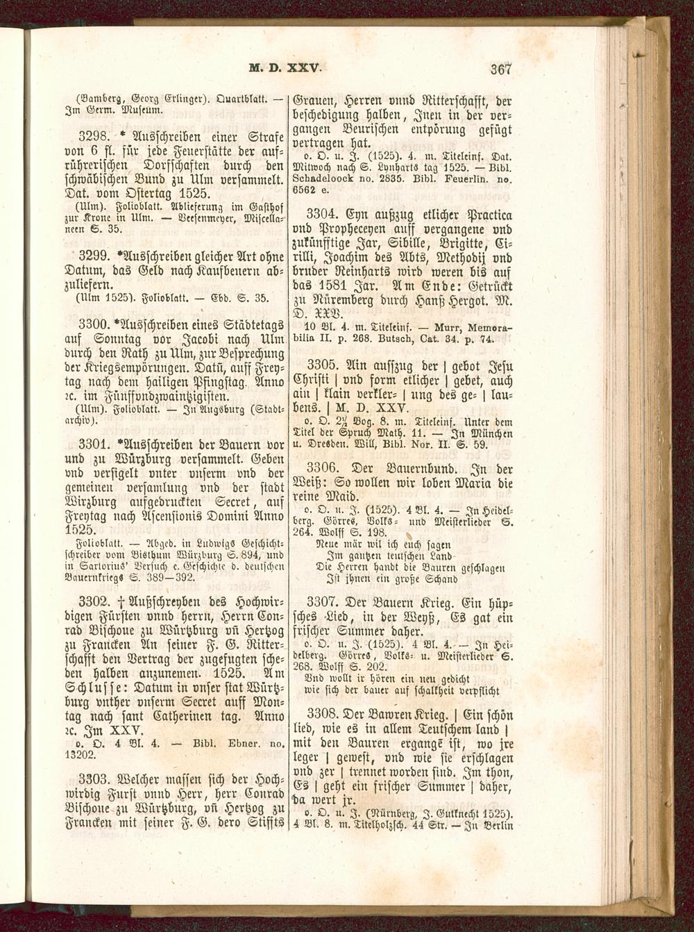 3304. Eyn außzug etlicher Practicavnd Propheceyen auff vergangene vndzutünfftige Jar, Sibille, Brigitte, Ci-rilli, Joachim des Abts, Methodij vndbrnder Reinharts wird weren bis aufdas 1581 Jar. Am Ende: Getrücktzn Nüremberg durch Hanß Hergot. M.D. XXV.