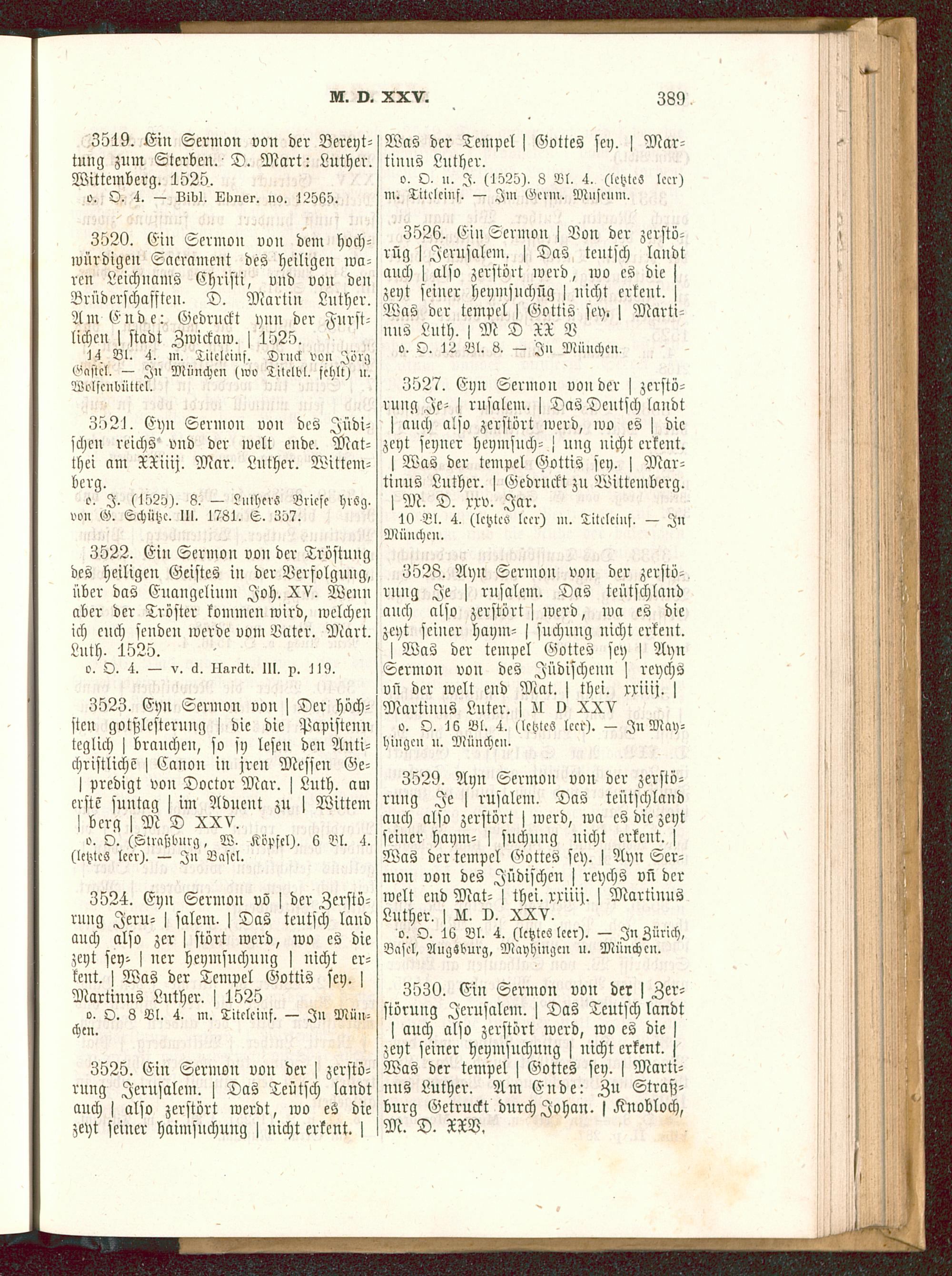 3526. Ein Sermon j Von der zerstö-rüg j Jerusalem , j Das teutsch landtauch j also zerstört werd, wo es die Izeyt seiner heymsnchüg > nicht erteilt, jWas der tempel j Gottis sey. > Marti-mls Luth. j M D XX V