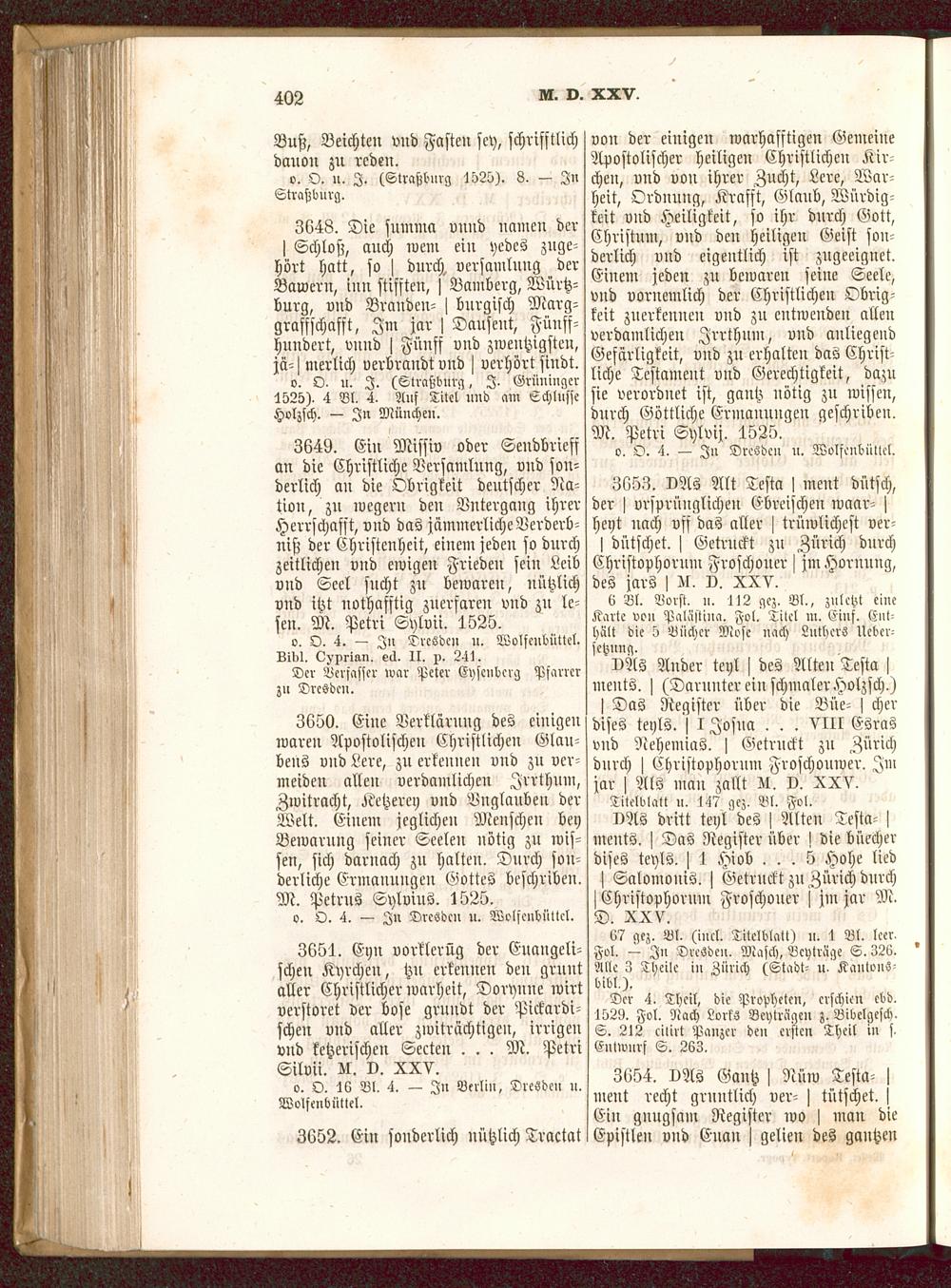3649. Ein Missiv oder Sendbriefsan die Christliche Versamlnng, vnd son-derlich an die Obrigkeit deutscher Na-tion, zu wcgern den Vntergang ihrerHerrschafft, vnd das jämmerliche Verderb-niß der Christenheit, einem jeden so durchzeitlichen vnd ewigen Frieden sein Leibvnd Seel sucht zu bewaren, nützlichvnd itzt uothafftig zuerfareu vnd zu le-sen. M. Pctri Sylvii. 1525.