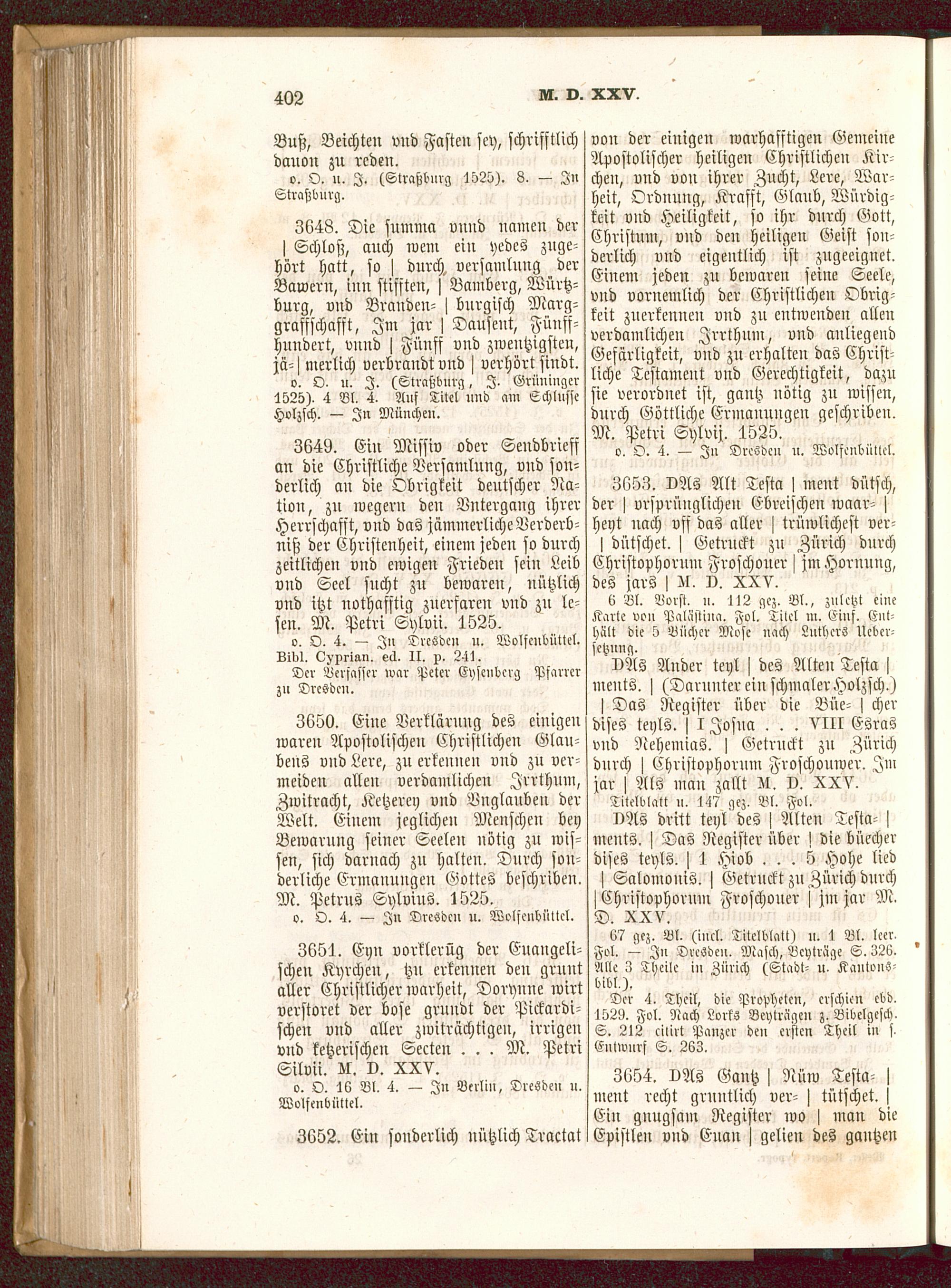 3650. Eine Verklärung des einigenwaren Apostolischen Christlichen Glau-bens vnd Lere, zu erkennen vnd zu ver-meiden allen verdamlicheu Irrthum,Zwitracht, Ketzerei) vnd Unglauben derWelt. Einem jeglichen Menschen beyBewarung seiner Seelen nötig zu wis-sen, sich darnach zu halten. Durch son-derliche Crmanuugen GotteS beschriben.M. Petrus Sylvius . 1525.
