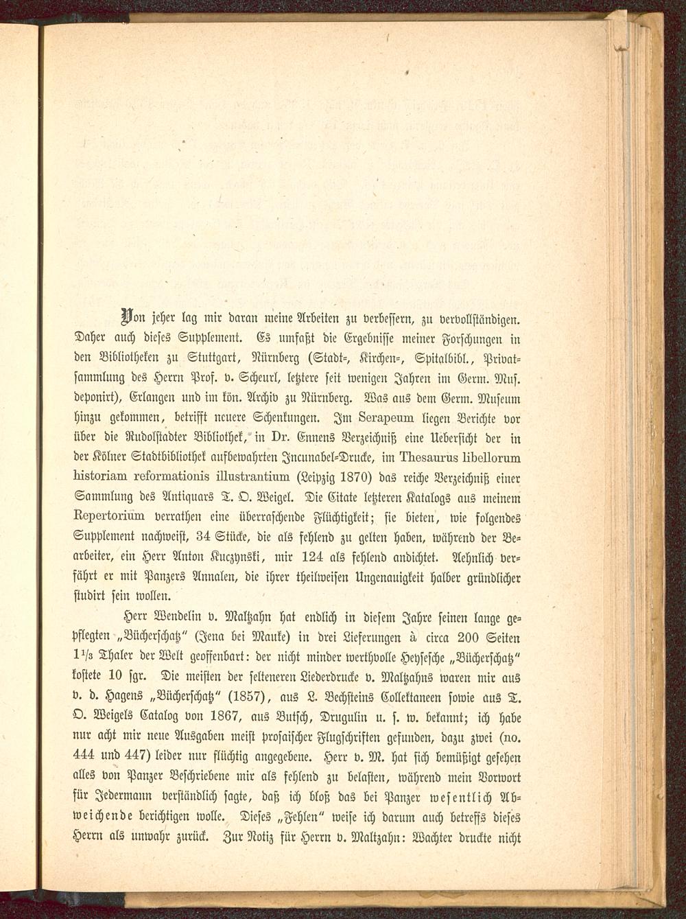 Herr Wendelin v. Maltzcchn hat endlich in diesem Jahre seinen lange ge-pflegten „Vücherschatz" (Jena bei Mauke) in drei Lieferungen ö. circa 200 Seiten1^/s Thaler der Welt geoffenbart: der nicht minder werthvolle Heysesche „Bücherschatz"kostete 10 sgr. Die meisten der selteneren Liederdrucke v. Maltzahns waren mir ausv. d. Hagens „Bücherschatz" (1857), aus L. Bechsteins Collektaneen sowie aus T.O. Weigels Catalog von 1867, aus Butsch, Drugulin u. s. w. bekannt; ich habenur acht mir neue Ausgaben meist prosaischer Flugschriften gefunden, dazu zwei (no.444 und 447) leider nur flüchtig angegebene. Herr v. M. hat sich bemüßigt gesehenalles von Panzer Beschriebene mir als fehlend zu belasten, während mein Vorwortfür Jedermann verstündlich sagte, daß ich bloß das bei Panzer wesentlich Ab-weichende berichtigen wolle. Dieses „Fehlen" weise ich darum auch betreffs diesesHerrn als unwahr zurück. Zur Notiz für Herrn v. Maltzahn: Wachter druckte nicht