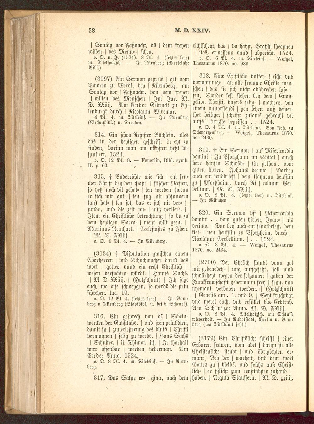 319. f Ein Sermon i auf Misericordiadomini ! Zu Pfortzhnim im Spital > durchHerr Hansen Schwöb- > lin gethan, vomguten Hirten. Jvhaüis dceimo > Darbeyauch ein seudbrieff j dem klayncnn heufflinzu j Pfortzhaim, durch Ni j colaum Gcr-bcllium. > M. D. Miiij.