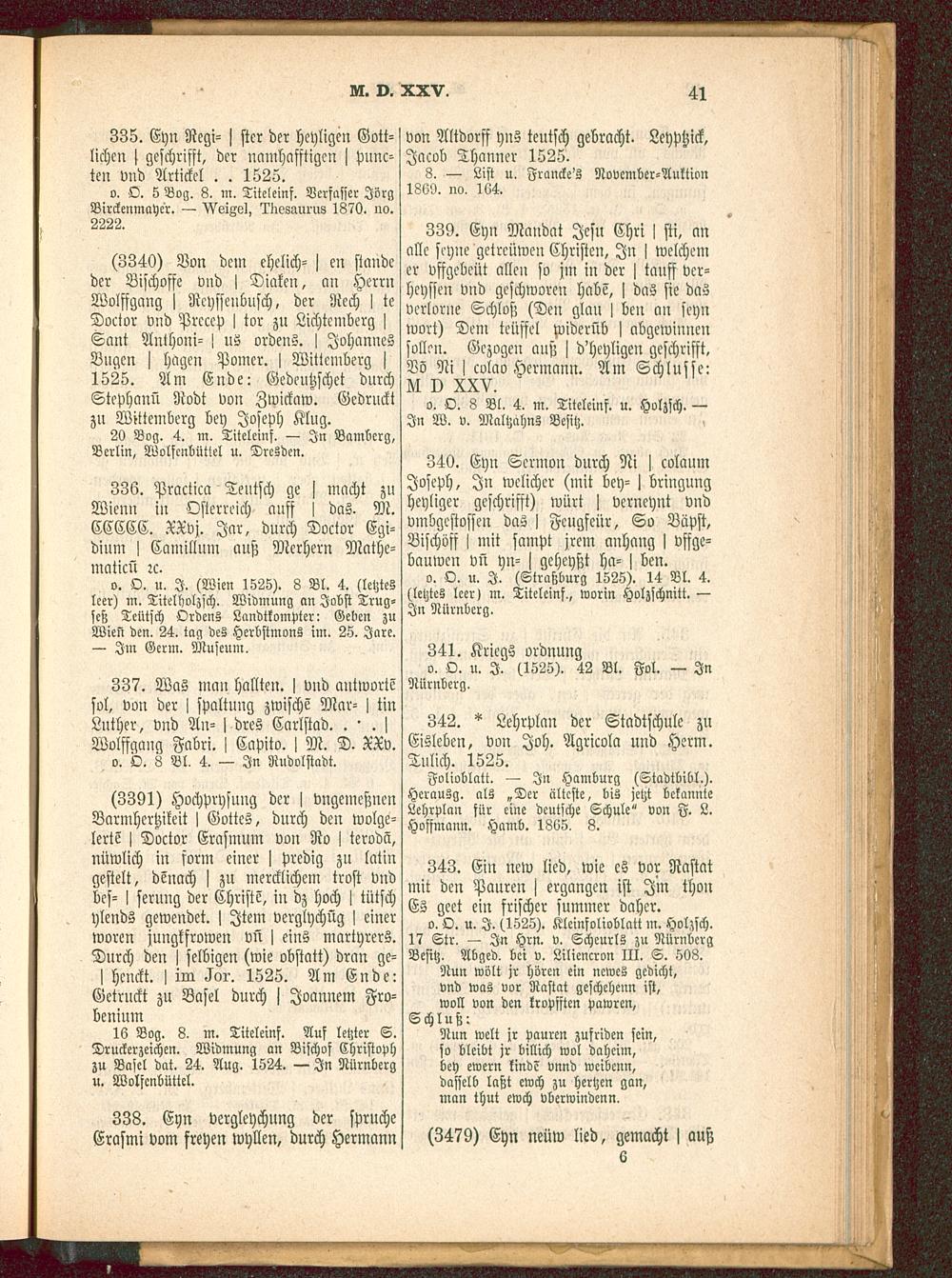339. Eyn Mandat Jesu Chri > sti, anolle seyne getrcüwen Christen, In j welchemer vffgebeüt allen so jm in der > tauff ver-heyssen vnd geschworen habe, > das sie dasVerlorne Schloß (Den glan ! ben an seynwort) Dem teüssel widerüb > abgewinnensollen. Gezogen anß j d'heyligen geschrifft,Vö Ni > cvlao Hermann. Am Schlüsse:N I) XXV.