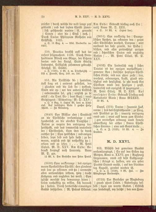 (3652) Ein suuderlich nutz j licherTractat vö der eynigen warhafftigen:gemeyne Apo > stolischer heyligeu Christ-lichen Kirche, vud von yhrer zucht j lere,warheyt, ordeuuugen, krafft, glaub wir-digkeyt vnd heyligkeyt, so yhr durch GotChristum vnnd den heyligen j geyst,suuderlich vud eyniglich ist tzugeeygent...M. Petri Siluij. M. D. XXV. Aufvorletzter Seite: Gedruckt Diustag nochNatiuitatis Marie > Anno MDXXV.