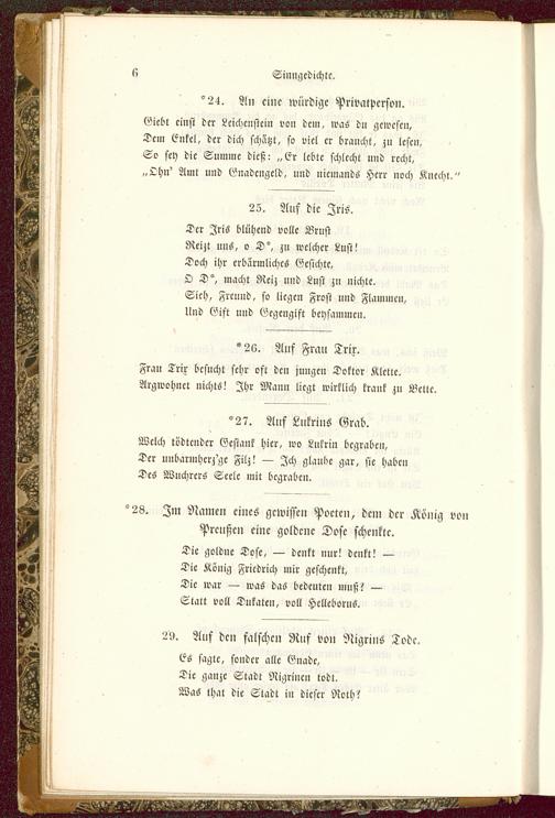 Der Iris blühend volle WrustReizt uns, o D°, zu welcher Lust!Doch ihr erbärmliches Gesichte,OD", macht Reiz und Lust zu nichte.Sich, Freund, so liegen Frost und Flammen,lind Gift und Gegengift beysammen.