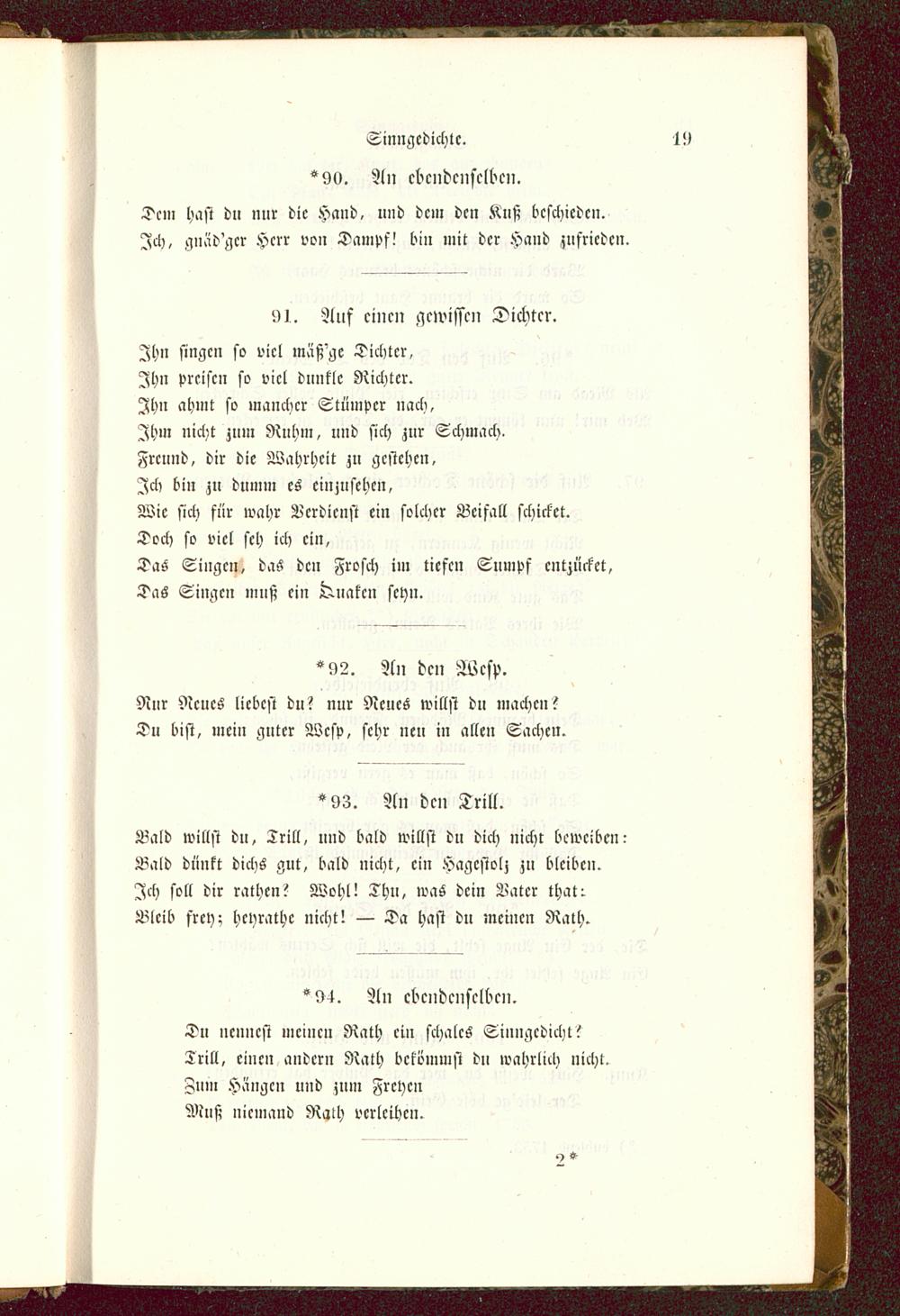 Bald willst dn, Trill, und bald willst du dich nicht beweiben:Bald dünkt dichs gut, bald nicht, ein Hagestolz zn bleiben.Ich soll dir rathen? Wohl! Thu, was dein Vater that:Bleib frey; hcyrathc nicht! — Da hast dn meinen Rath.