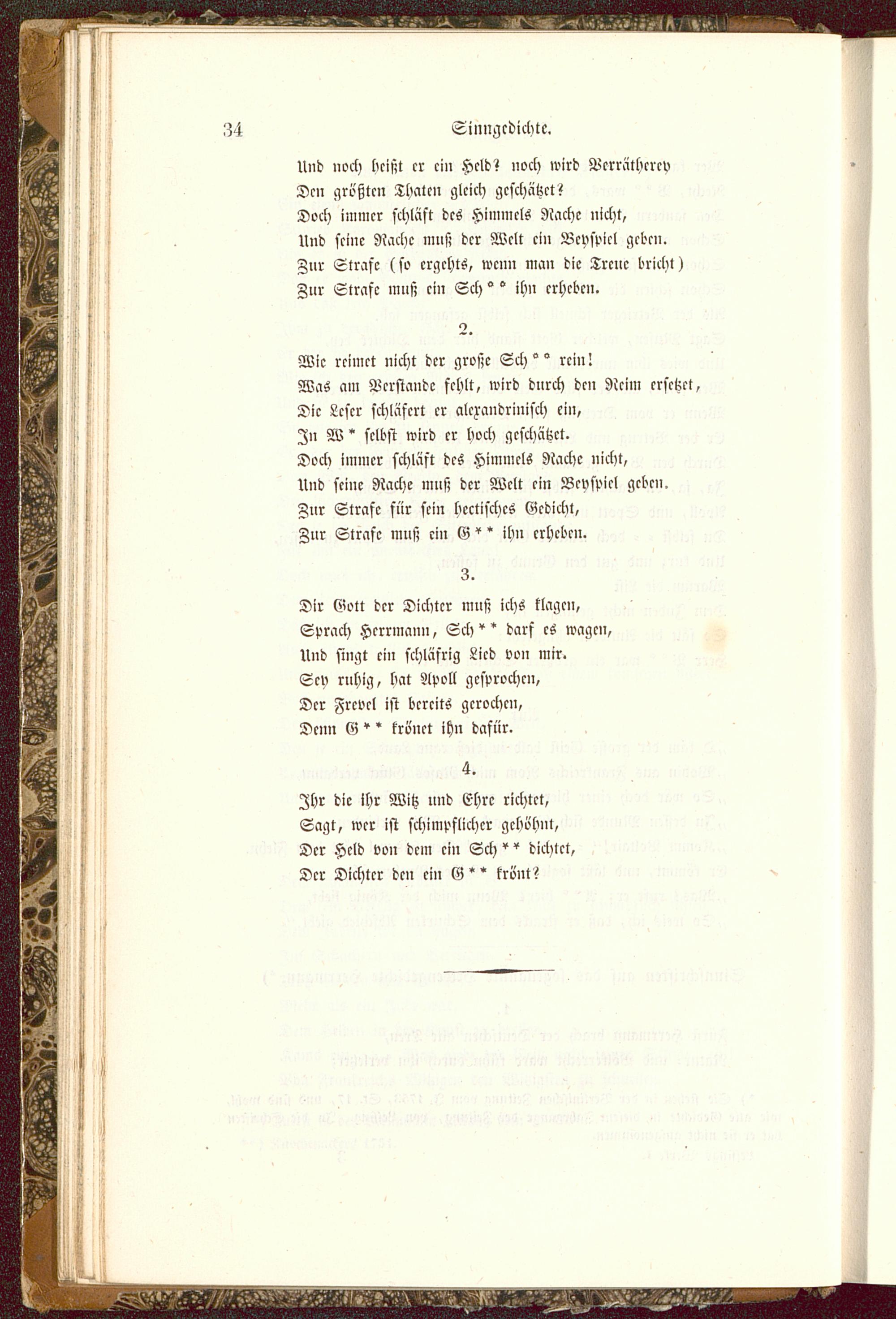 Dir Gott der Dichter ninß ichs klagen,Sprach Herrmann, Sch*' darf es wagen,Und singt ein schläfrig Lied von mir.Sey ruhig, hat Apoll gesprochen,Der Frevel ist bereits gerochen,Denn G * ' krönet ihn dafür.