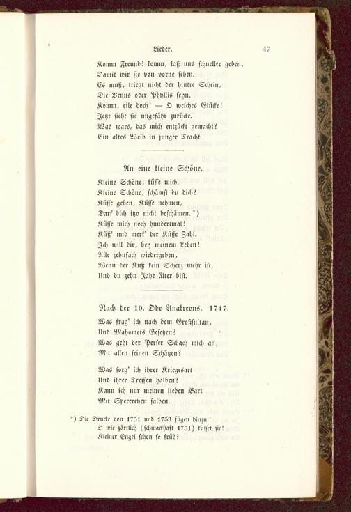 Kleine Schöne, küsse mich.Kleine Schöne, schämst du dicb?Küsse geben, Küsse nehme»,Varf dich itzo nicht beschämen. °)Küsse mich noch hundertmal!Küß' und merk' der Küsse Fahl.Ich will dir, bey meinem Leben!Alle zehnfach wiedergeben,Wenn der Kuß kein Scherz mehr ist,Und du zehn Jahr älter bist.