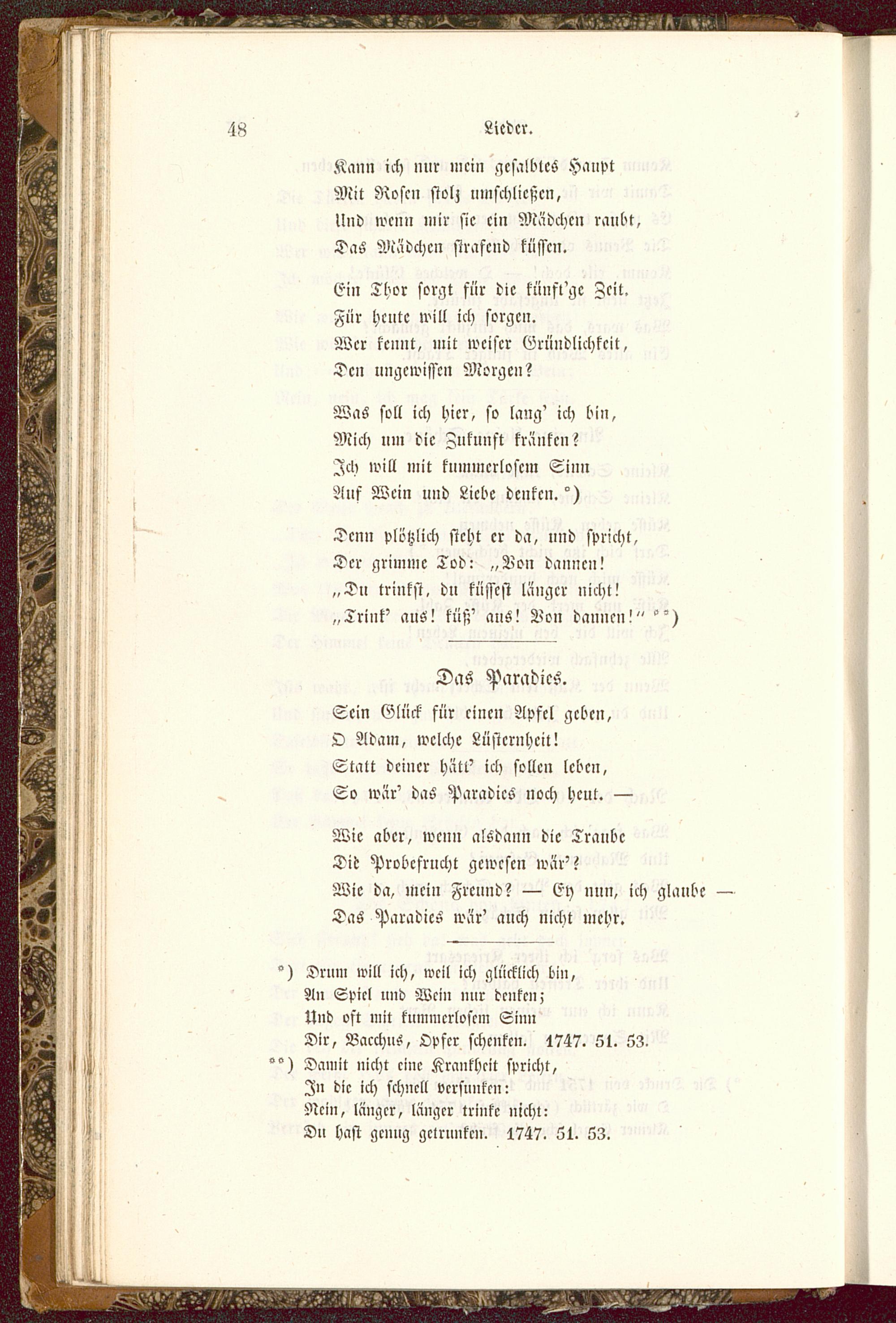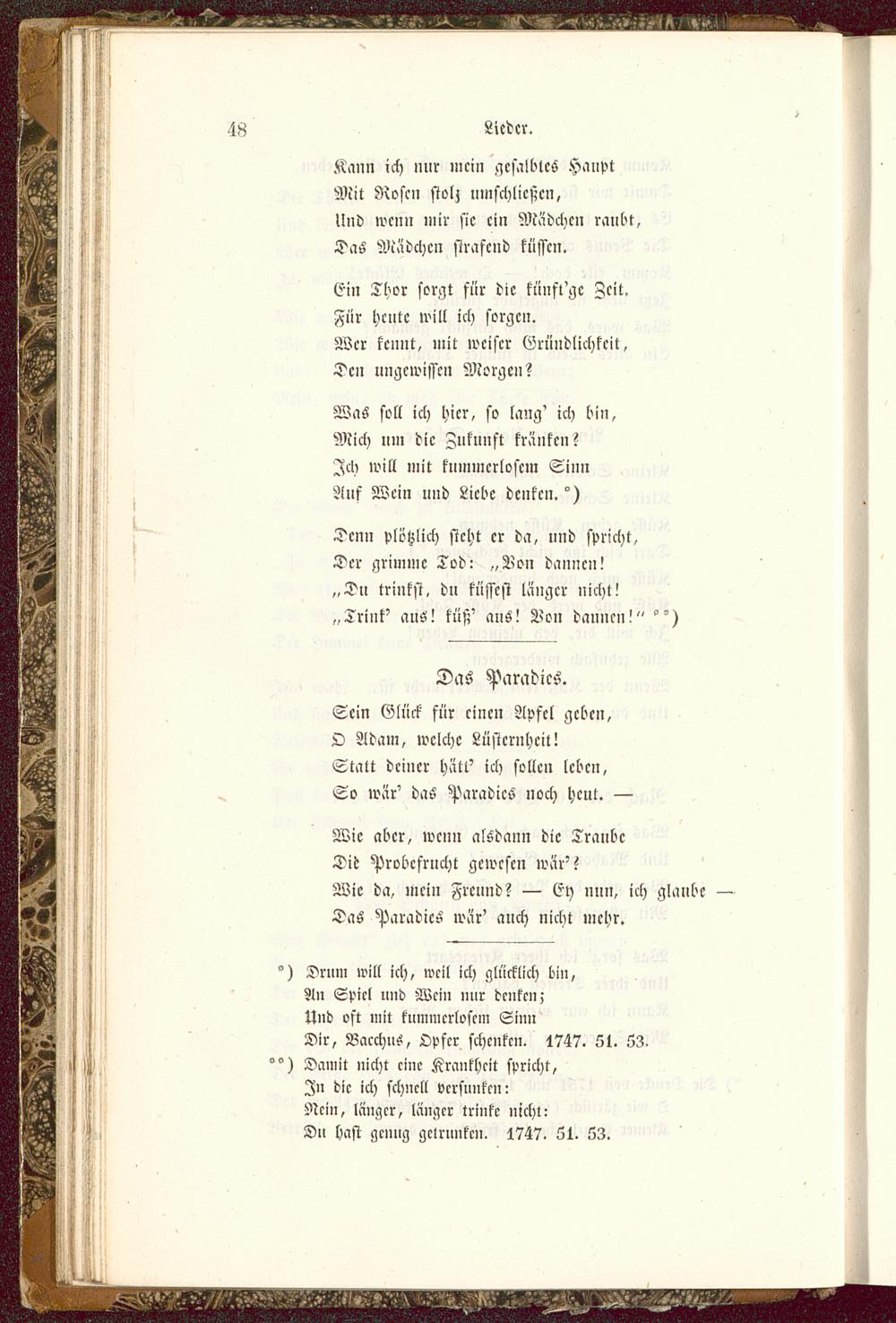 °) ?rum will ich, weil ich glücklich bin,A» Spiel und Wein mir denke».Und oft mit knmmerlosciii SinnDir, Bacchus, Opfer schenken. 1747. St. SZ.°°) Damit nicht eine Krankheit spricht,In die ich schnell versunken:Nein, länger, länger trinke nicht:Du hast genug getrunken. 1747. 51. 53.