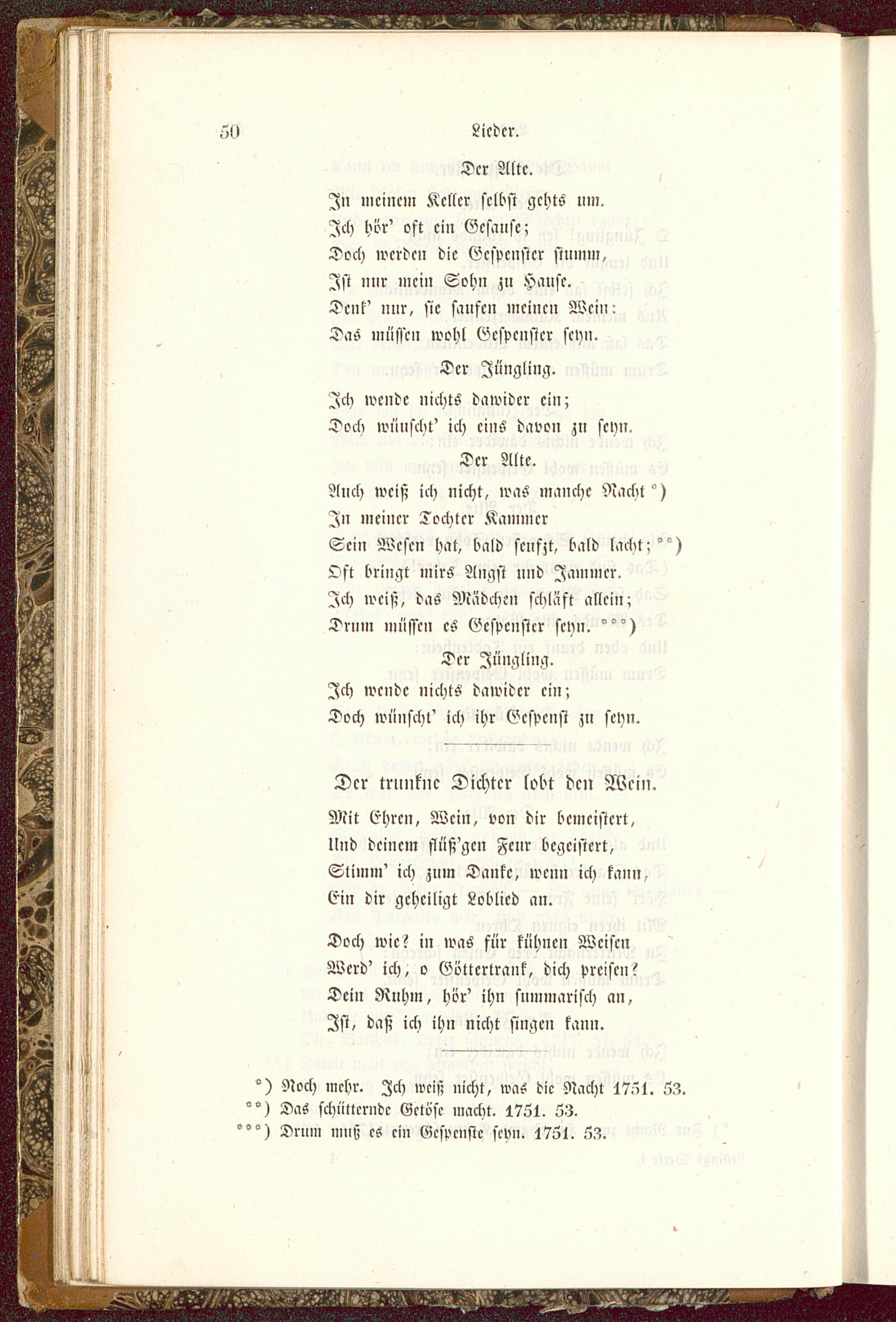 Der Alte.In nicincm Kcllcr selbst gchts um.Ich hör' oft ein Gcsausc;Doch werden die Gespenster stumm,Ist nur mein Sohn zu Hause.Denk' nur, sie saufen meinen Wein:DaS müssen wohl Gespenster seyn.